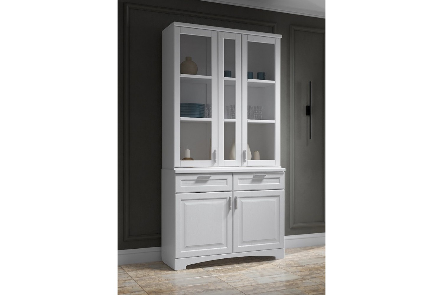 Буфет дополнен распашными каркасными дверцами со стеклом, вместительными полками, выдвижными ящиками. В качестве декоративных элементов использованы молдинги, фигурные накладки, что придает мебели в сочетании с белым оттенком изысканный вид.