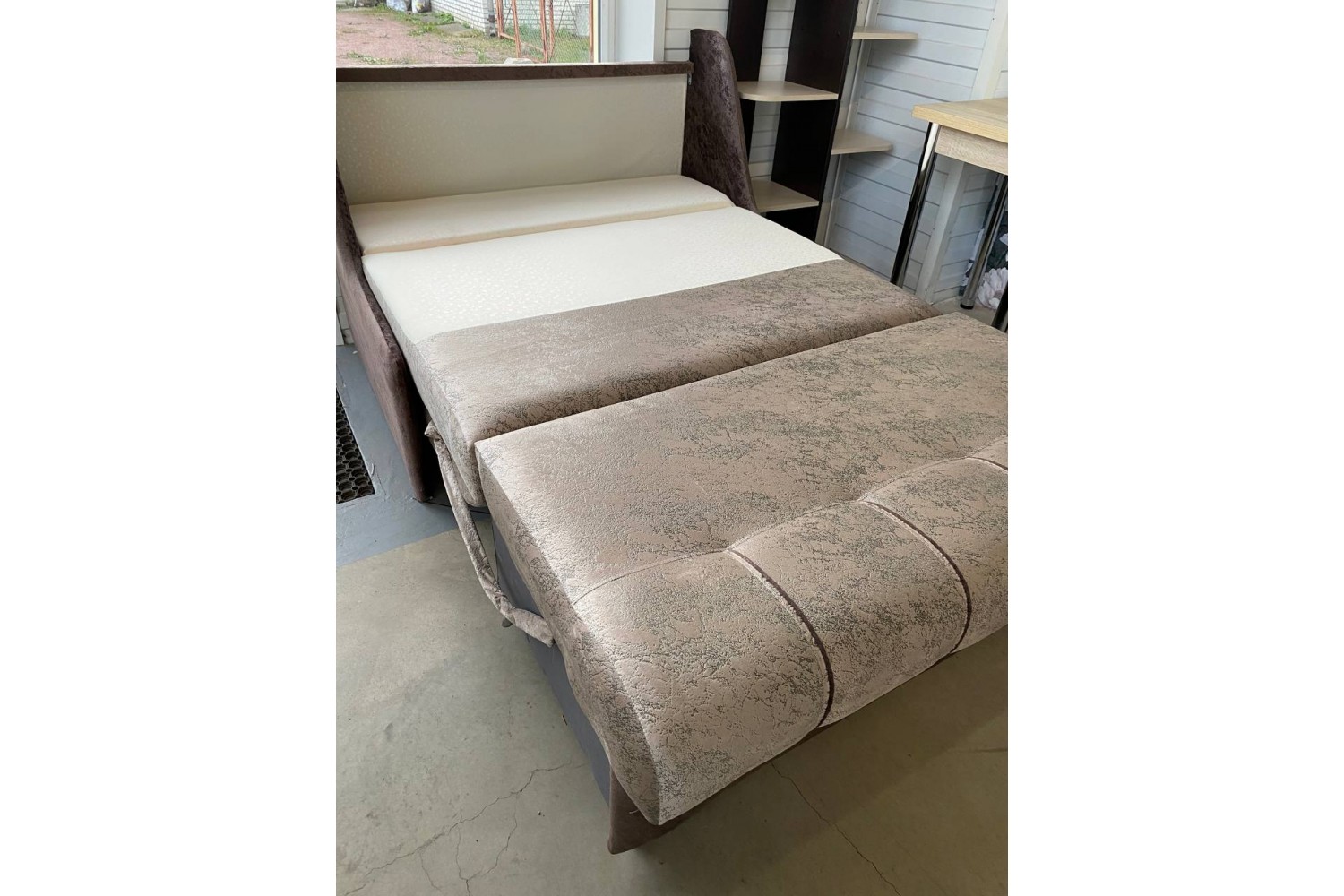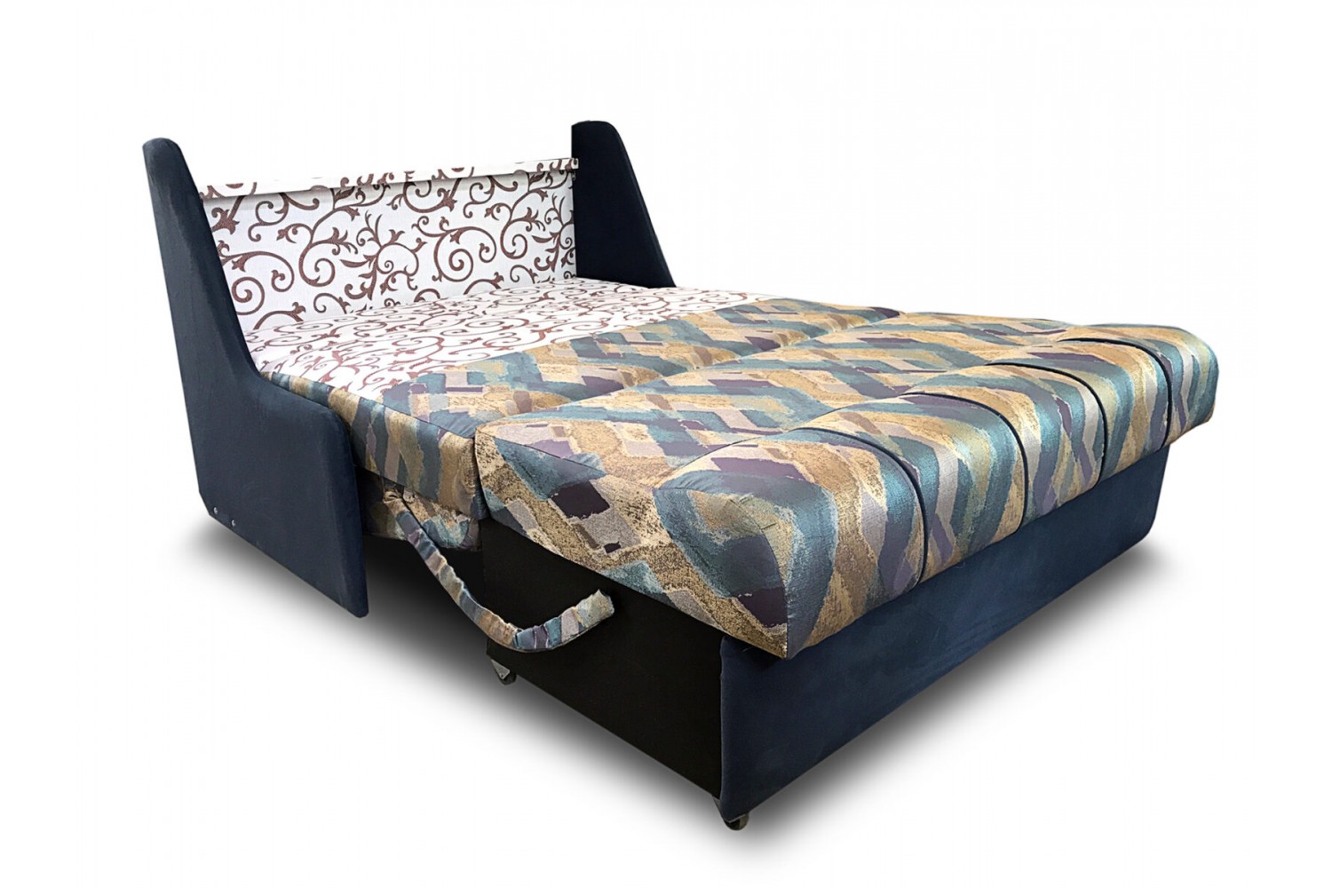 Разложить диван очень просто. Для этого нужно спинку дивана потянуть вниз, сиденье на прорезиненных колесиках выкатится вперед. Затем опустить подголовник. Диван-кровать готов к использованию;