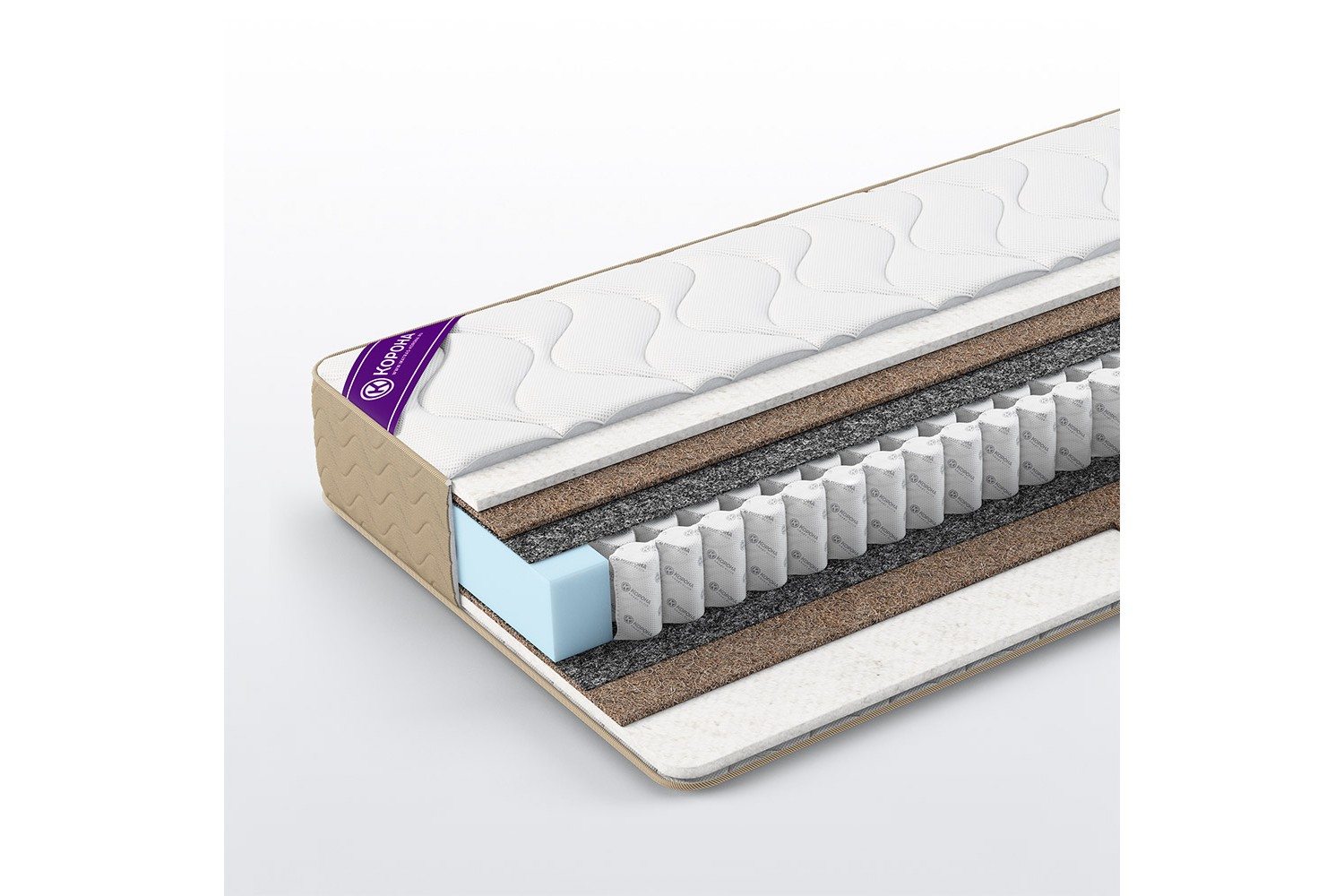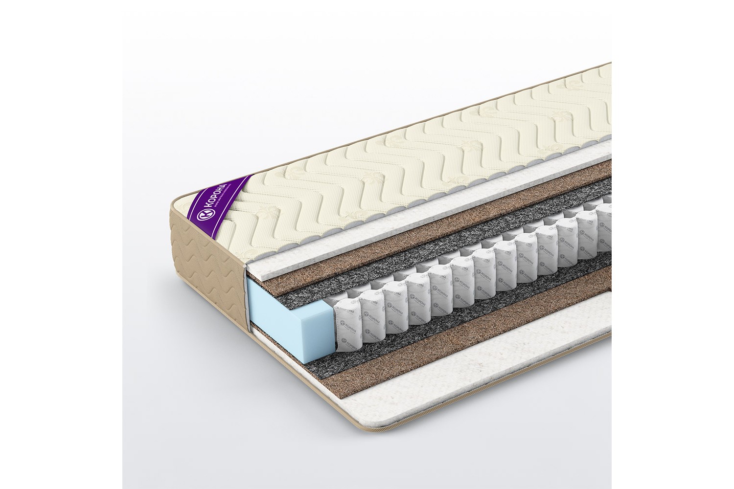 Комфортный матрас средней жесткости на основе блока независимых пружин. В качестве наполнителя используется натуральное латексированное кокосовое волокно, которое равномерно распределяет нагрузку по поверхности спального места и обеспечивает поддержку позвоночника. Мягкий гипоаллергенный наполнитель струттофайбер придает комфорт, сохраняет тепло и не впитывает влагу.