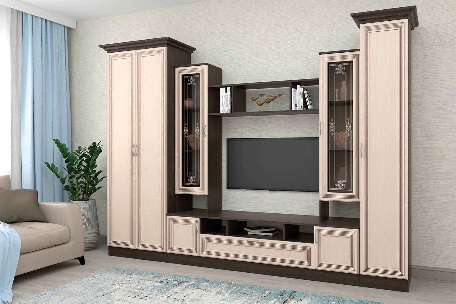 Изготовленная из качественных материалов, гостиная обладает сроком службы до 10 лет и гарантией 24 месяца, что подтверждает надежность и долговечность конструкции. Стекло с еврокромкой и пескоструйным рисунком добавляет изысканности и стиля, а пластиковые ручки обеспечивают удобство в использовании.