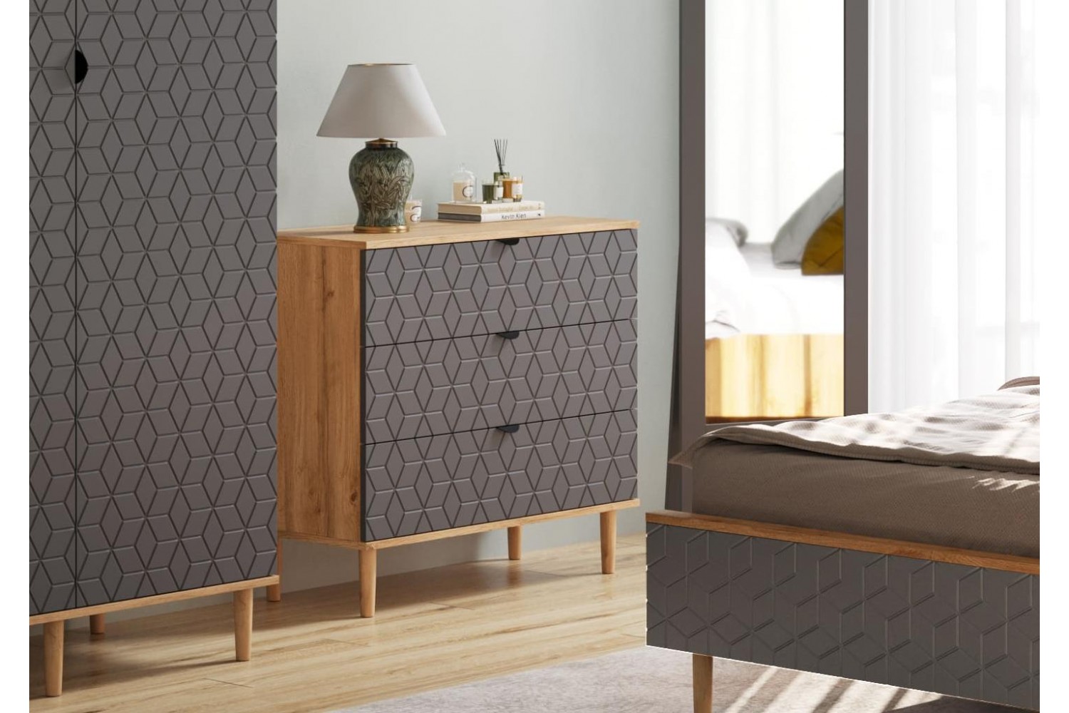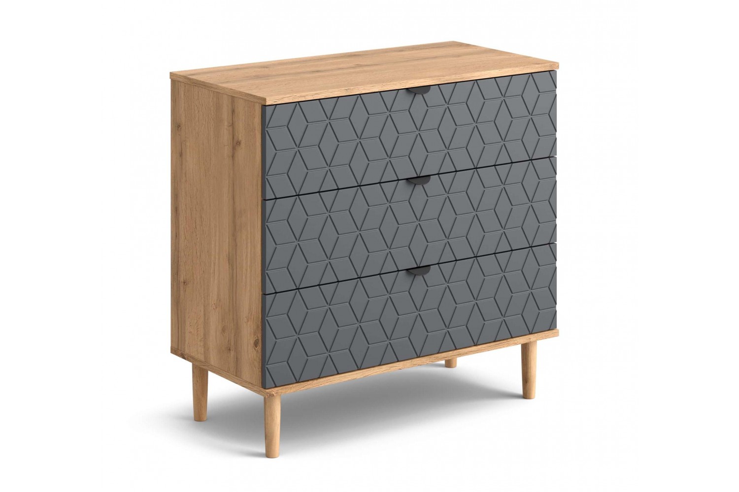 Изготовленный из качественных материалов, комод весит 37 кг, что гарантирует его устойчивость и долговечность. Элегантная фрезеровка на фасаде в виде кубов добавляет стильный акцент, делая мебель не только функциональной, но и эстетически привлекательной.