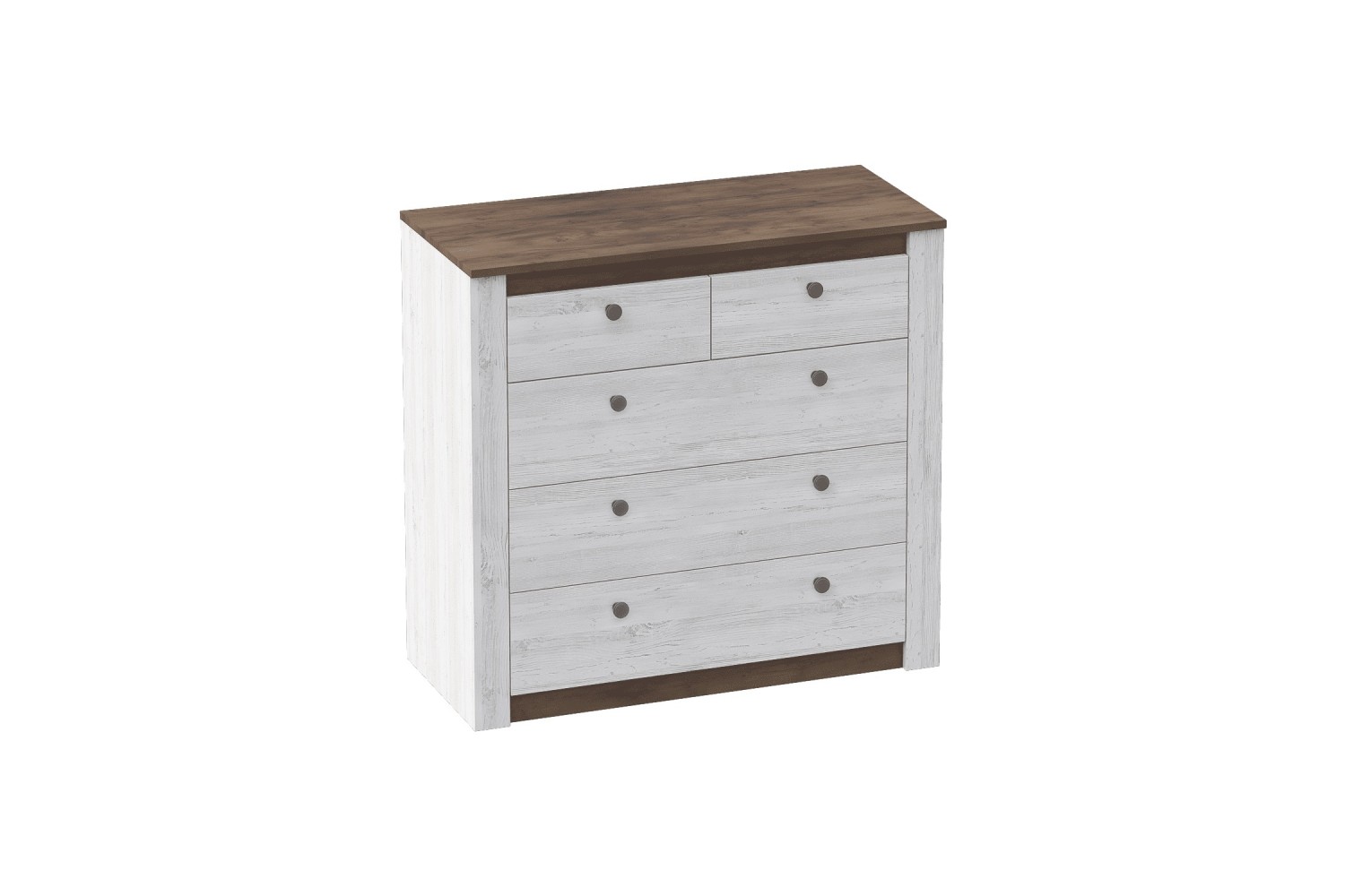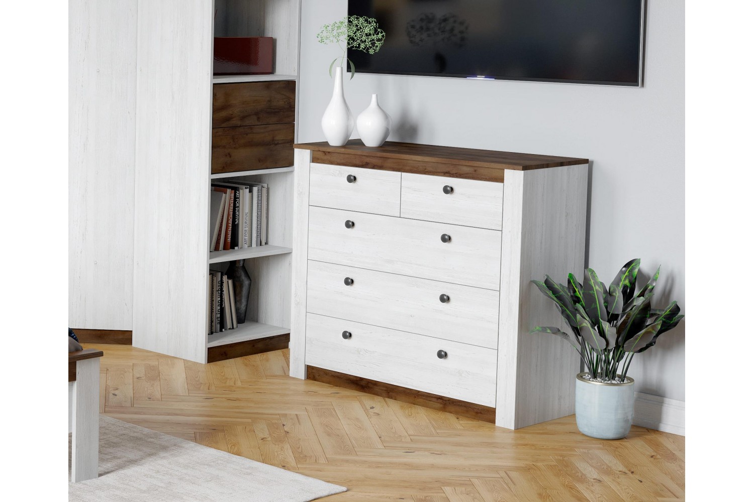 Комод оснащен пятью выдвижными ящиками на шариковых направляющих, что гарантирует легкость и бесшумность открывания. Цветовое исполнение в дубе Винтерберг и Таксонии придаст вашему интерьеру стильный и современный вид.