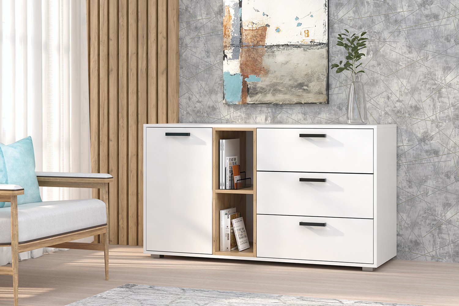 Комод оснащен вместительными ящиками с глубиной 400 мм, обеспечивающими достаточное пространство для хранения вещей. Пластиковые ручки добавляют комоду современный вид и удобство в использовании. Он поставляется в двух упаковках и имеет одностороннюю ориентацию сборки.