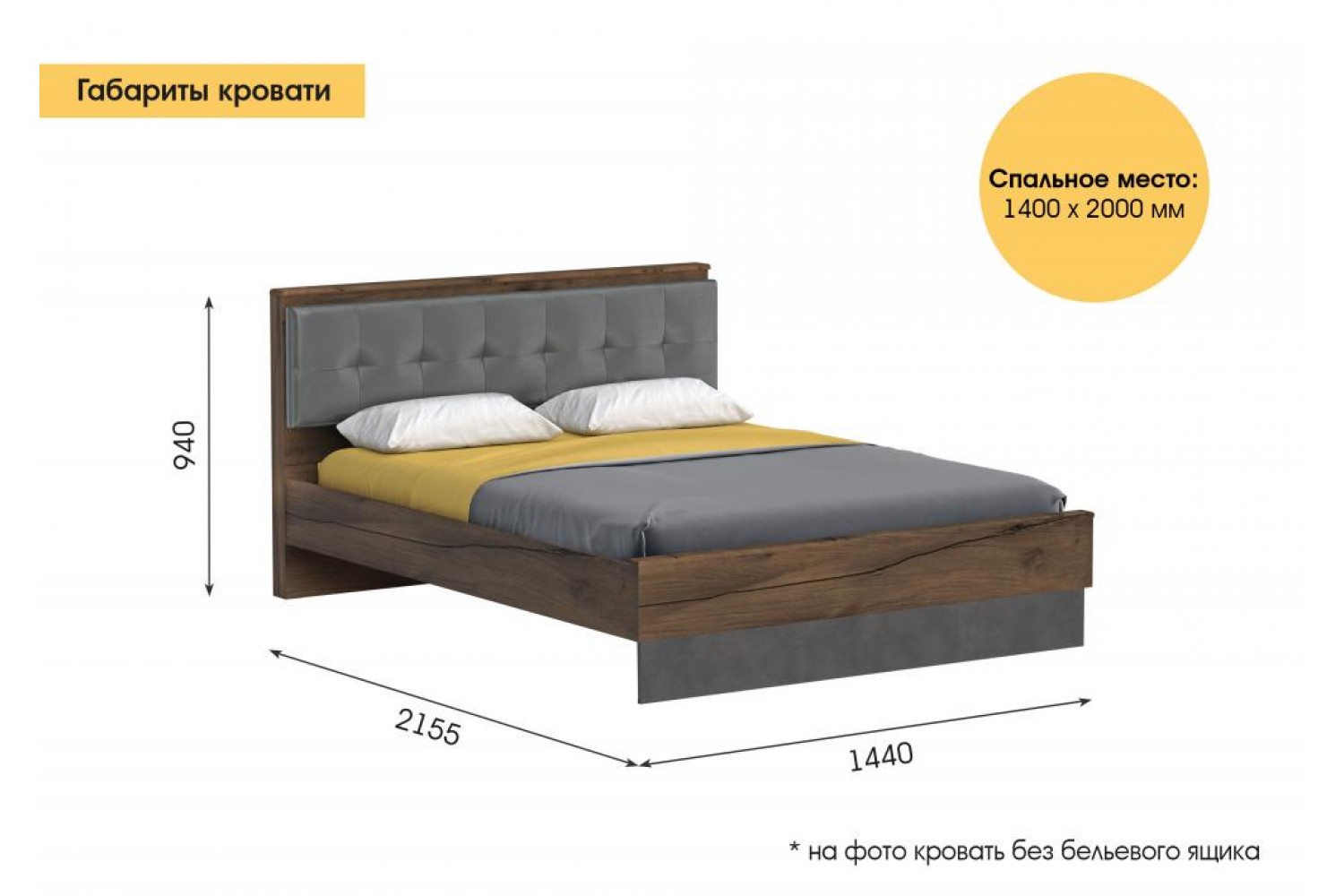 Размеры кровати составляют 1440 мм в ширину, 2155 мм в глубину и 940 мм в высоту, что делает её подходящей для стандартных спален. Спальное место размером 1400 мм на 2000 мм гарантирует достаточное пространство для отдыха.