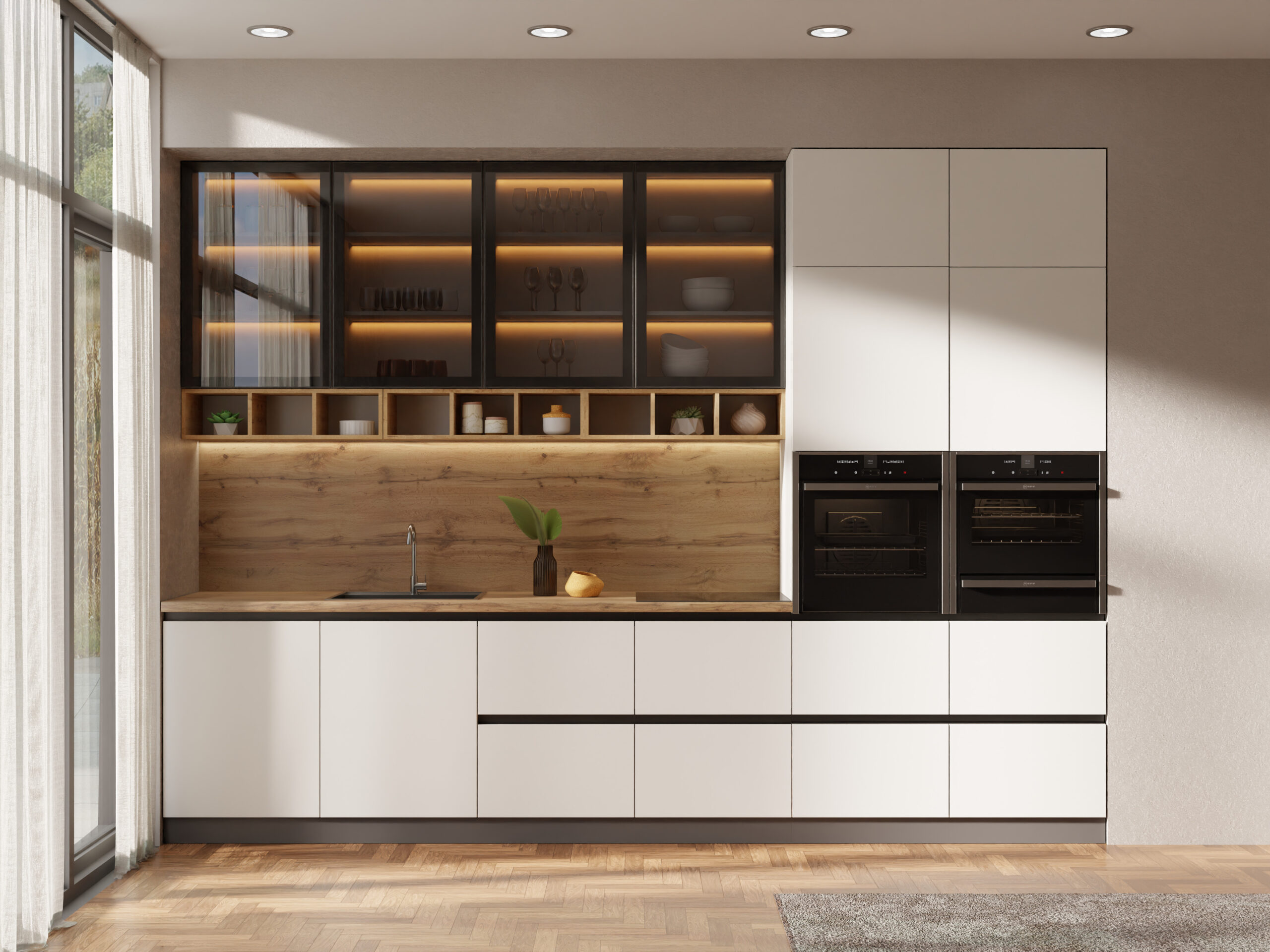 Цвета: светлые тона визуально расширяют комнату, темные добавляют уюта. Тренды 2026 — матовые фасады, открытые полки и интеграция с гостиной. В маленьких кухнях используйте высокие пеналы и выдвижные системы.