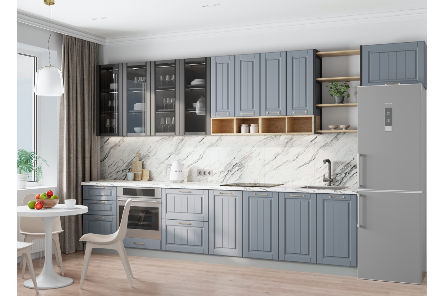 Темные фасады в сочетании с серыми деталями корпуса внесут в обстановку кухни благородство и элегантность. Отделанные стеклянными вставками верхние навесные шкафы сделают верхнюю линию кухонного комплекта более легкой и воздушной.
