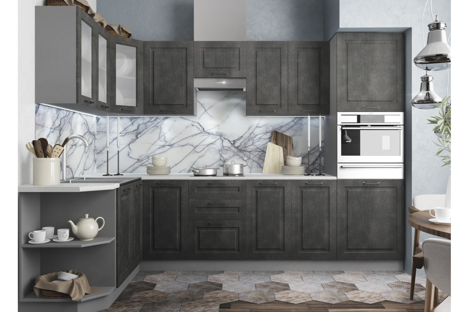 В классическом интерьере маленькой кухни будет эффектно смотреться камень темный, в большой – липа пепел.