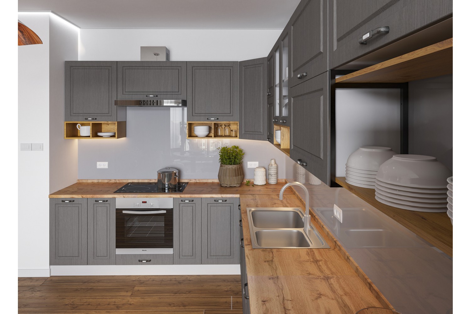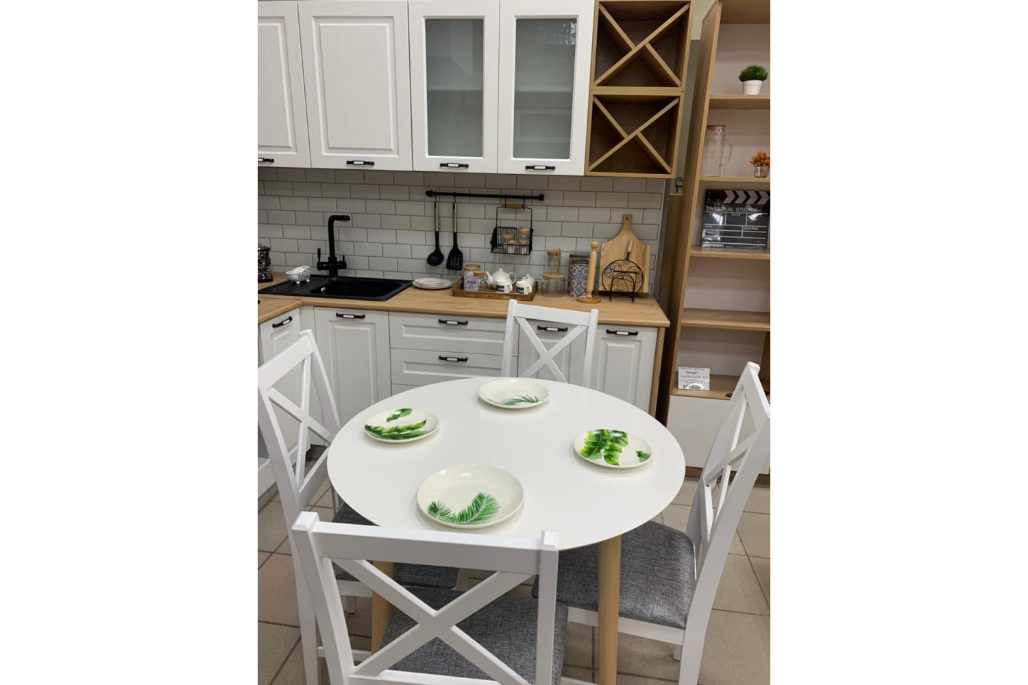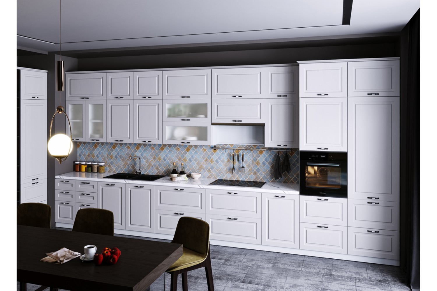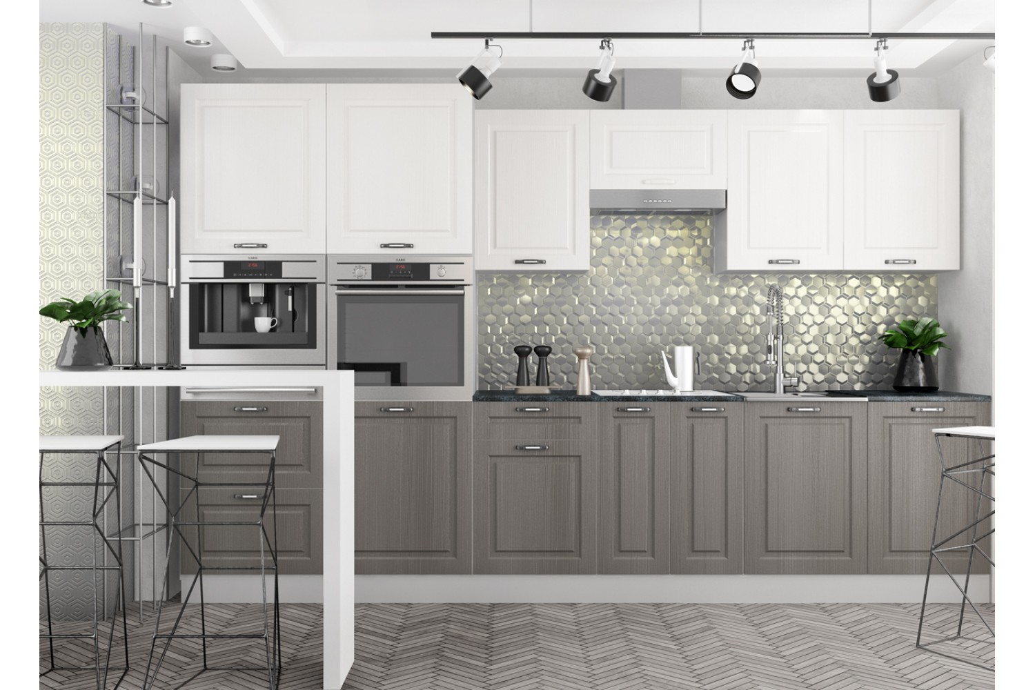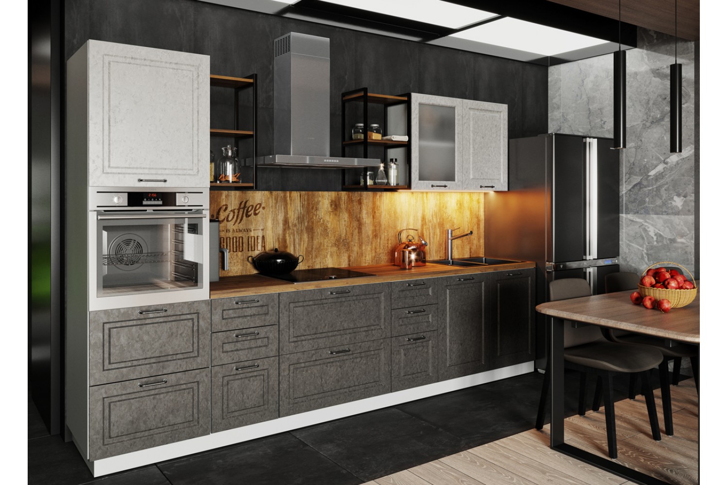 Всегда шикарно выглядит кухня с фасадами цвета липа белый и пепел.