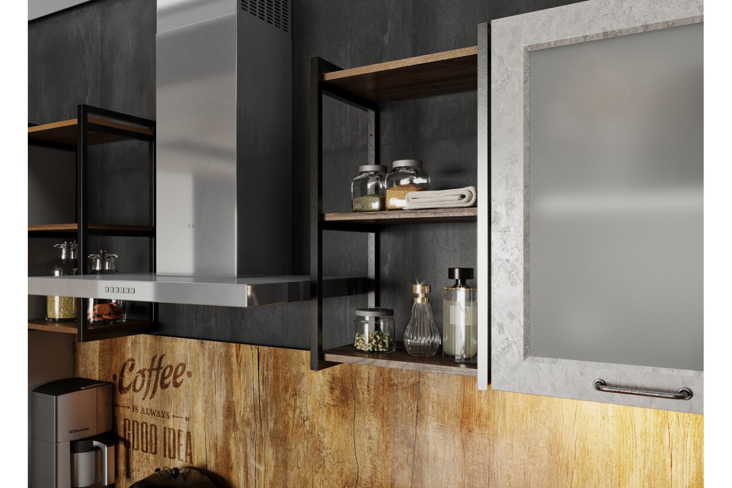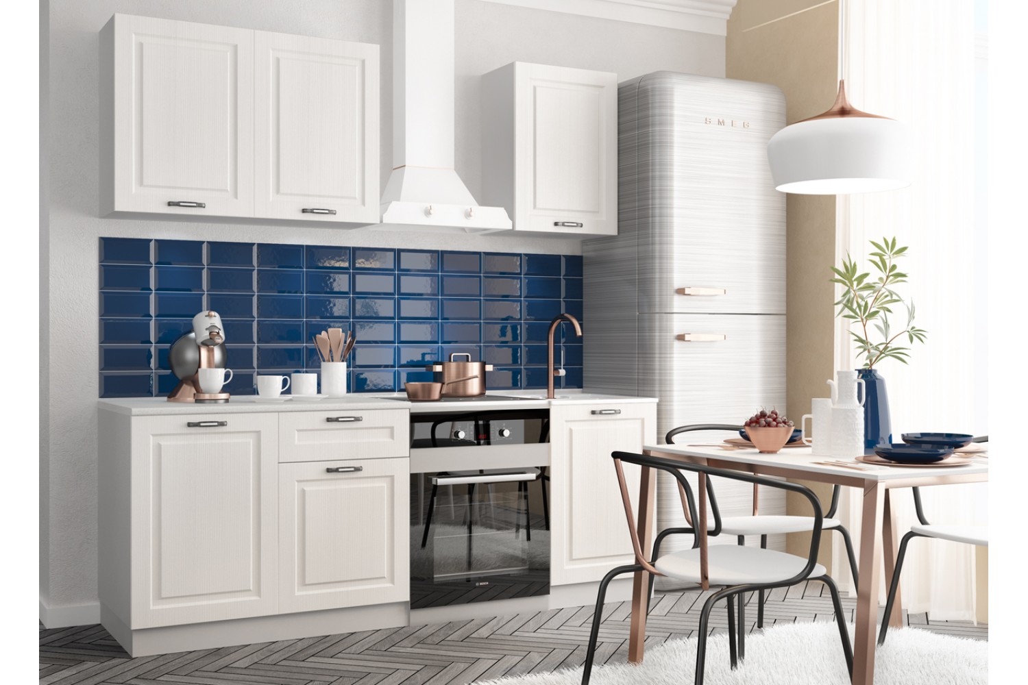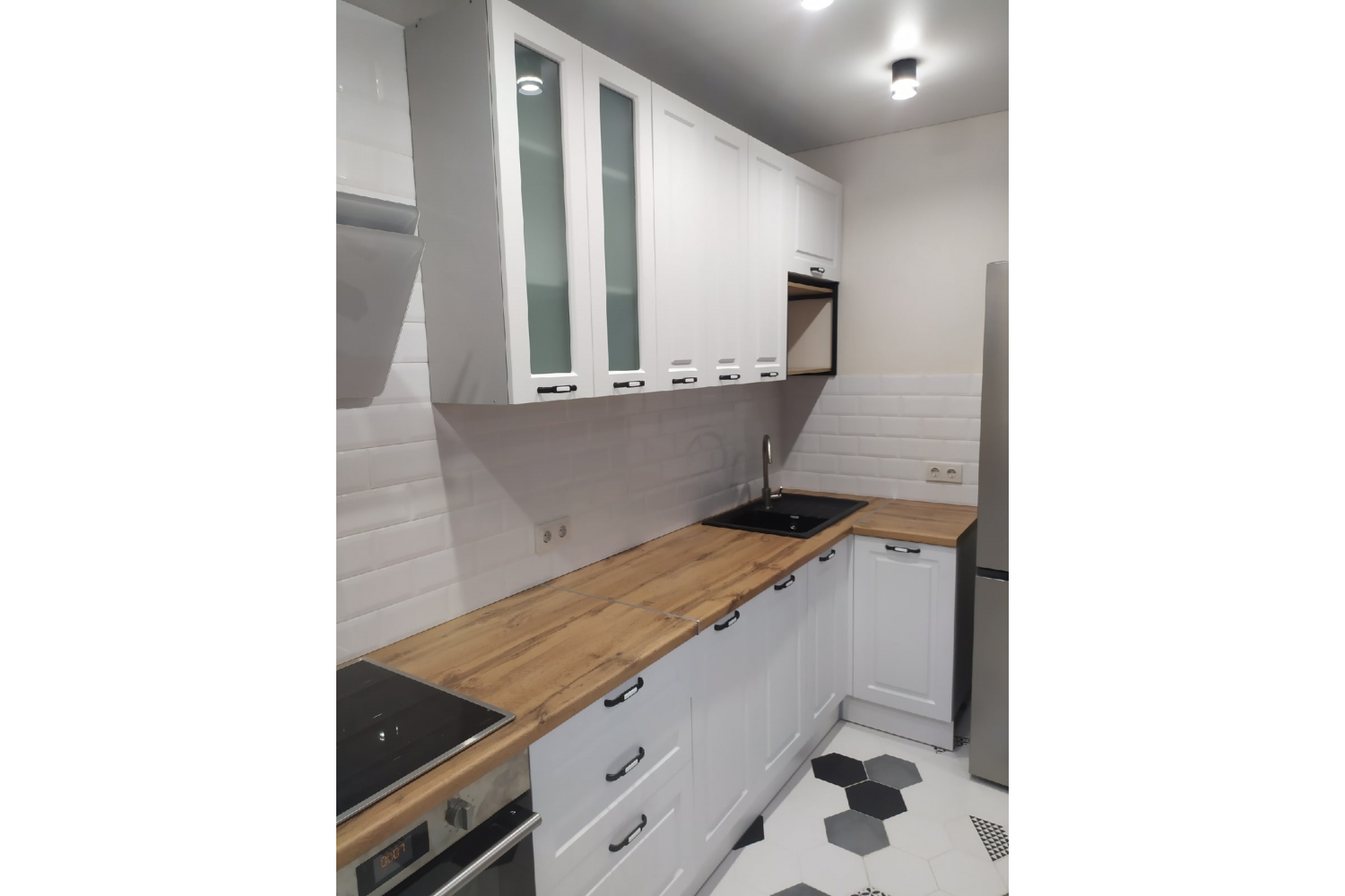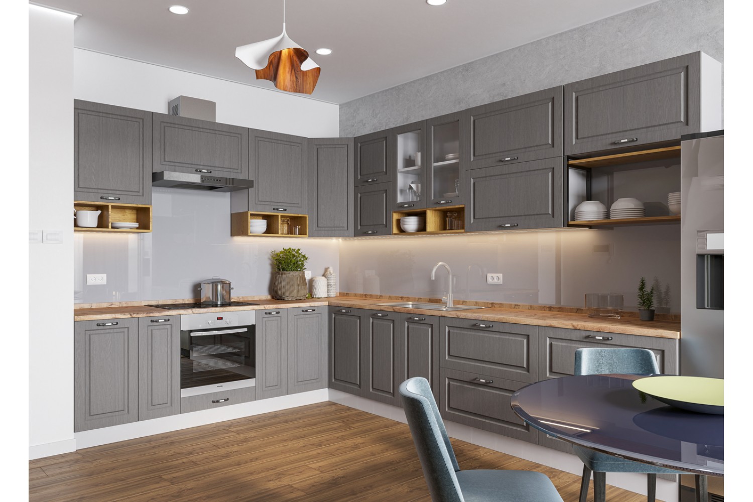 Фасады этого кухонного гарнитура дополнительно украшены небольшой фрезеровкой, а створки из стекла укомплектованы матовыми стёклами.