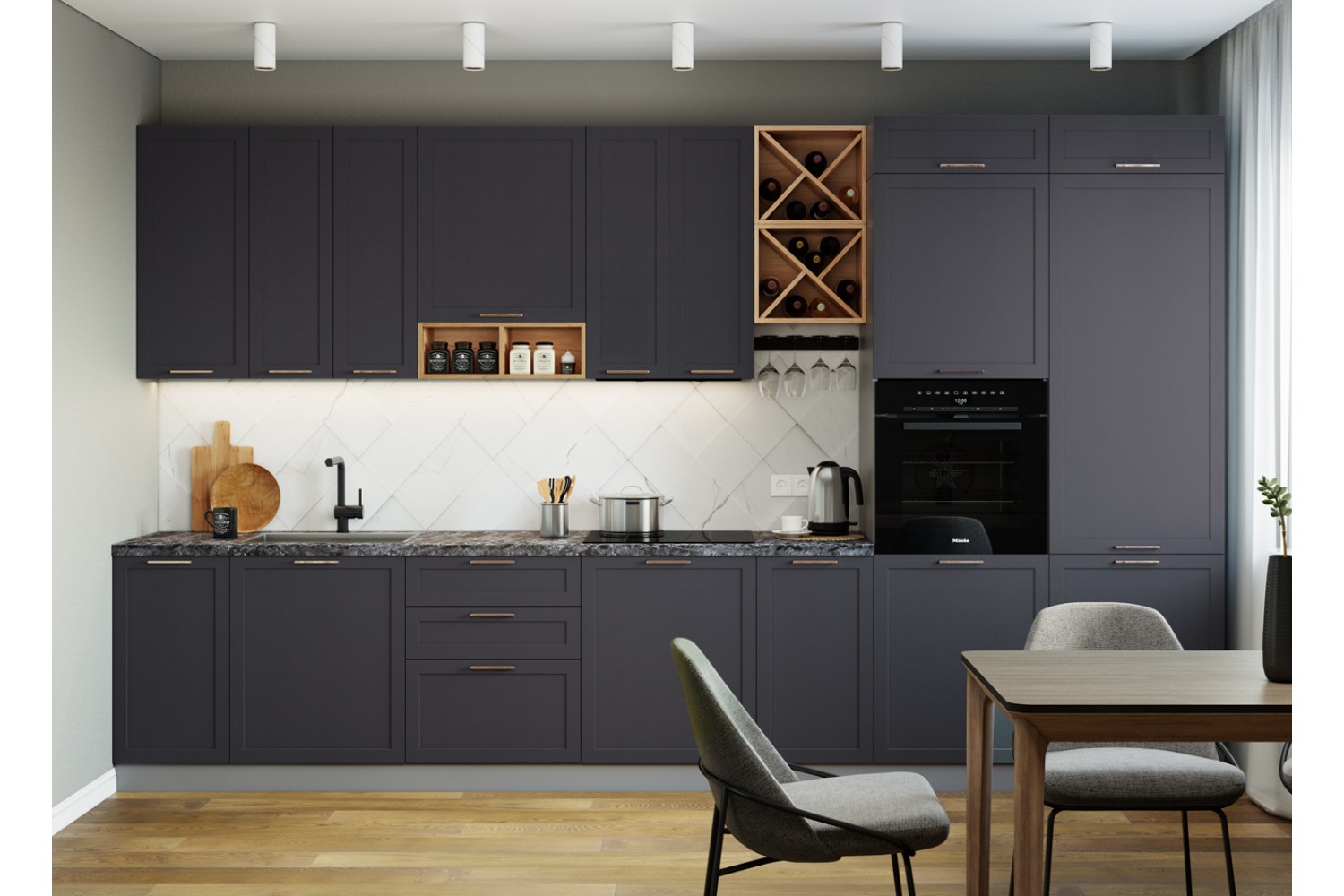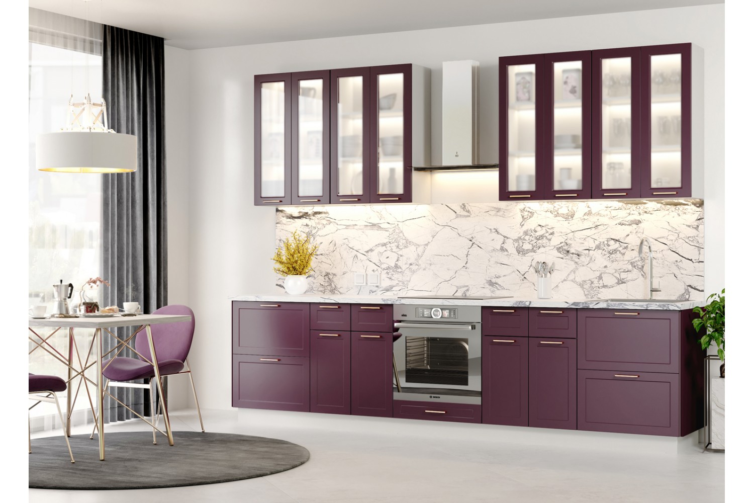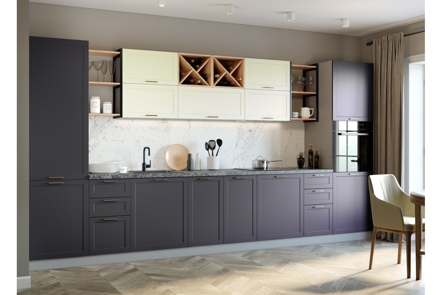 Корпусная кухонная мебель с фасадами глубоких насыщенных оттенков шоколадная кожа и черника легко вольется в модерновую симфонию чистых линий, лаконичных форм и ярких цветовых акцентов.