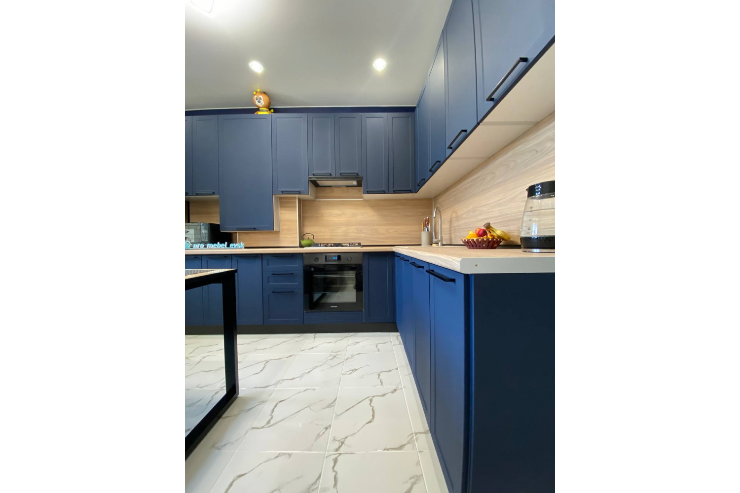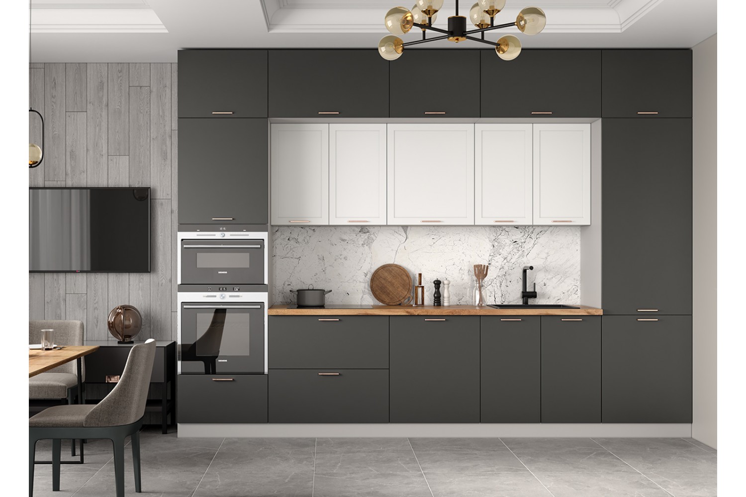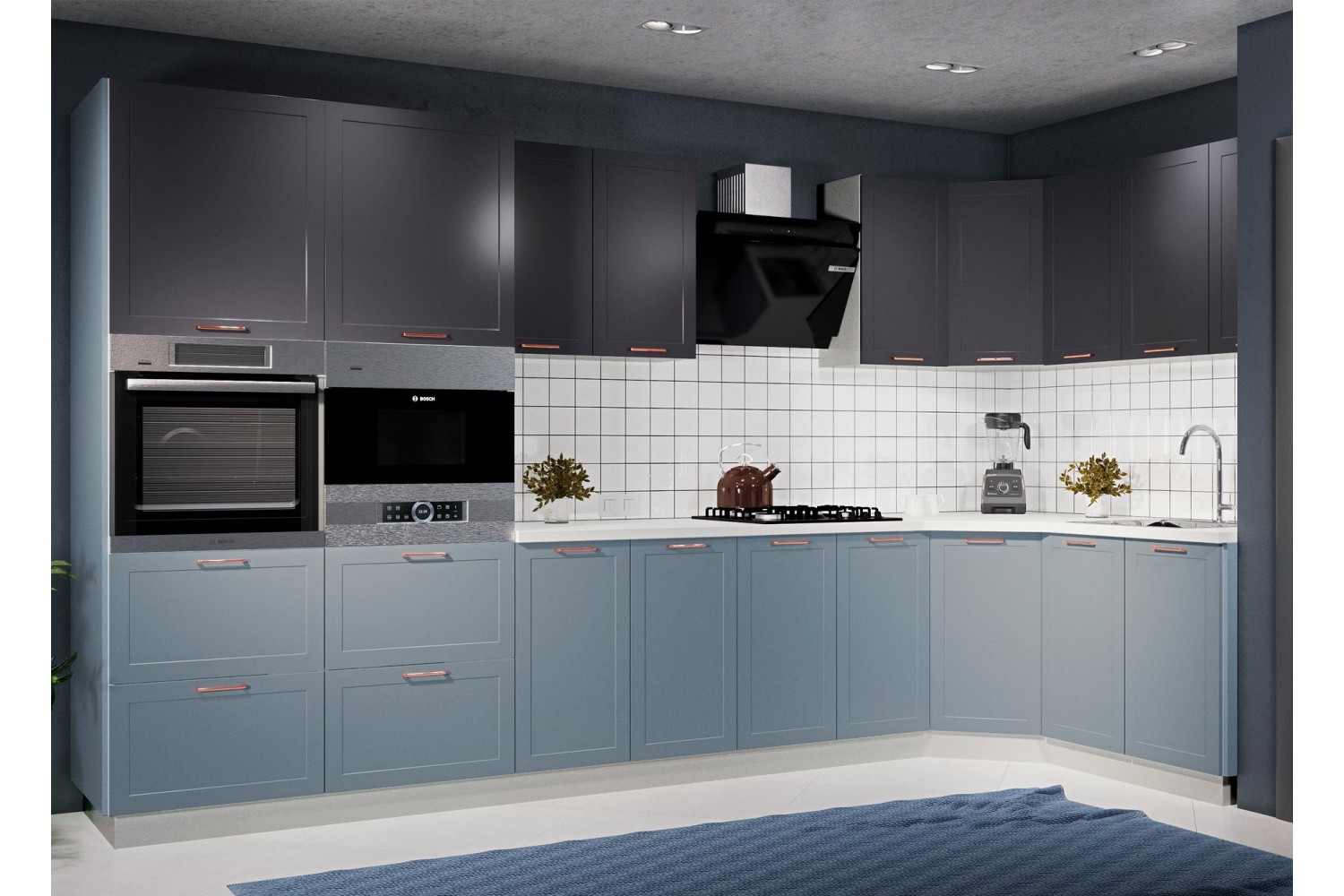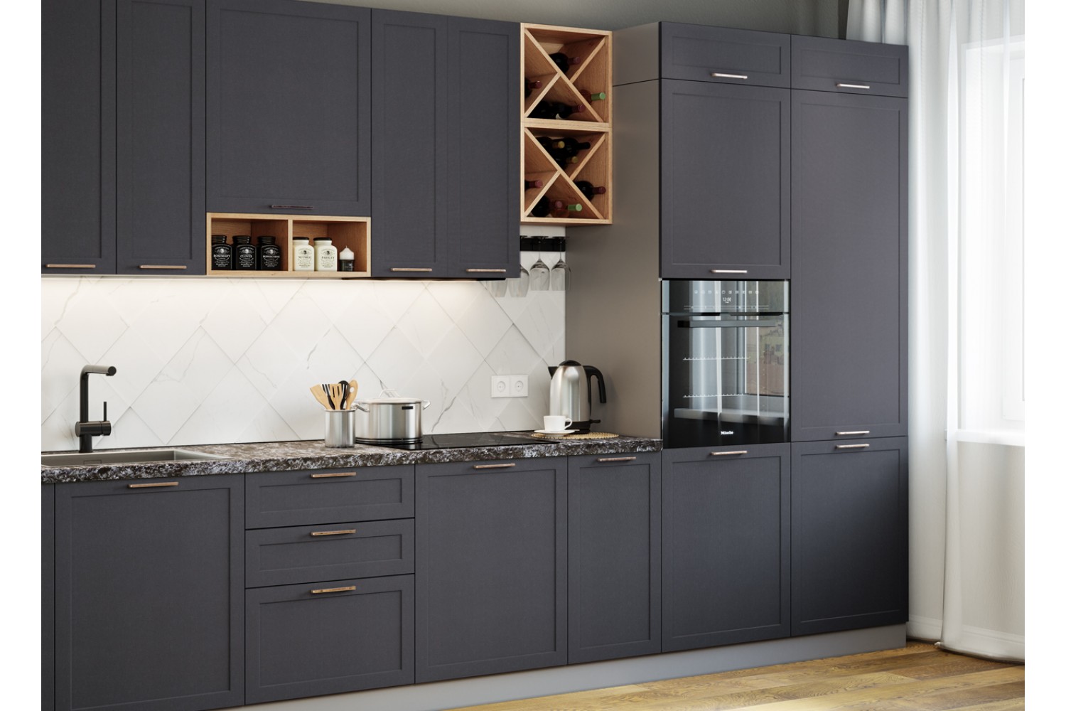 Корпусная кухонная мебель с фасадами глубоких насыщенных оттенков шоколадная кожа и черника легко вольется в модерновую симфонию чистых линий, лаконичных форм и ярких цветовых акцентов.