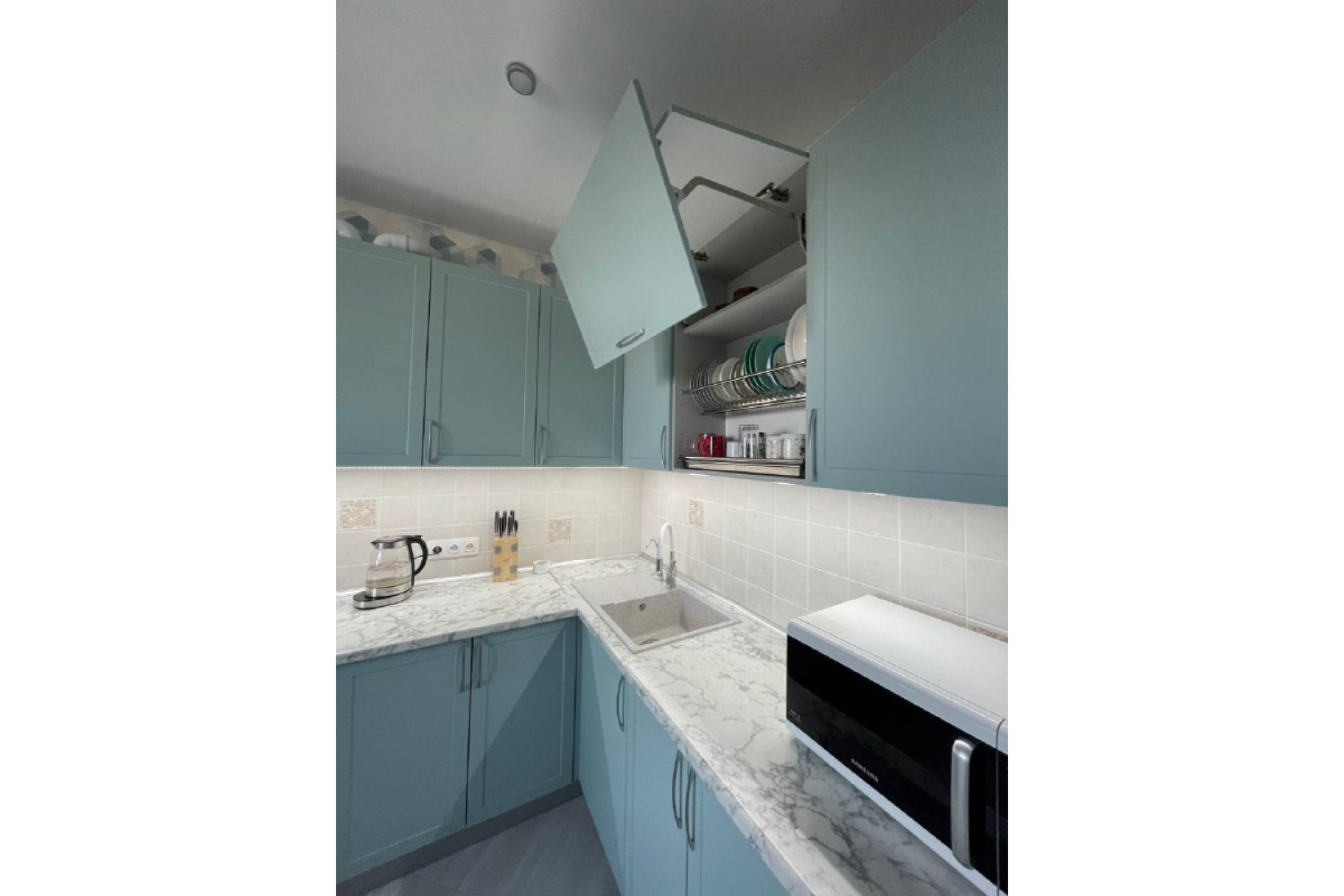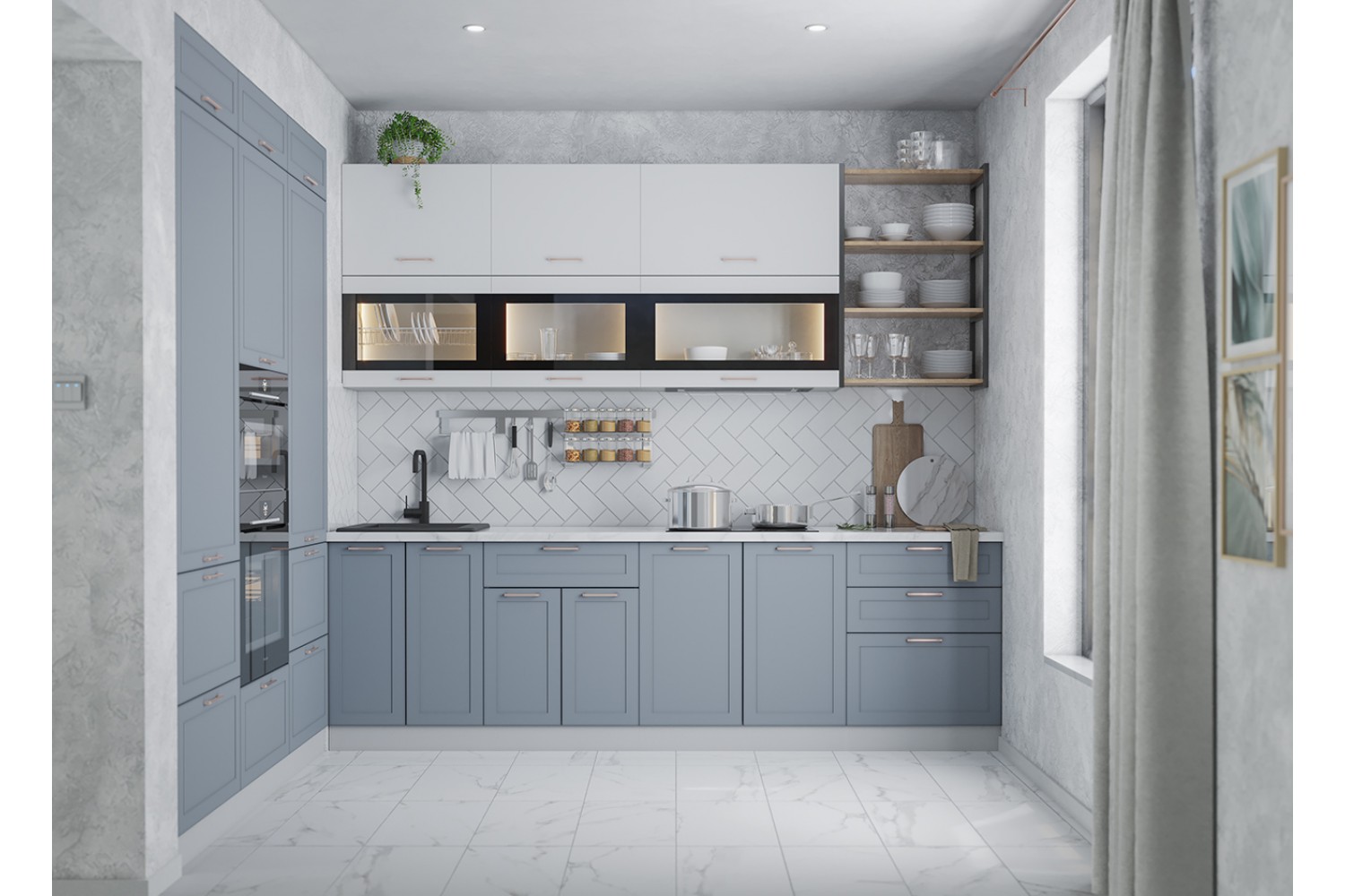 Открытые полки и подвесные шкафчики с остеклением вносят в облик кухонного гарнитура нотки легкости и воздушности.