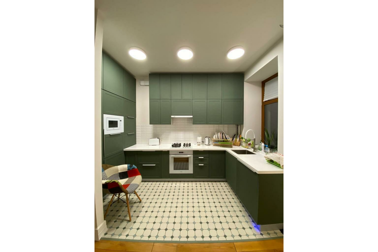 Кухня «Квадро» в цветах оливково-зеленый или лунный свет великолепно впишется в кухонный интерьер в стиле хай-тек.
