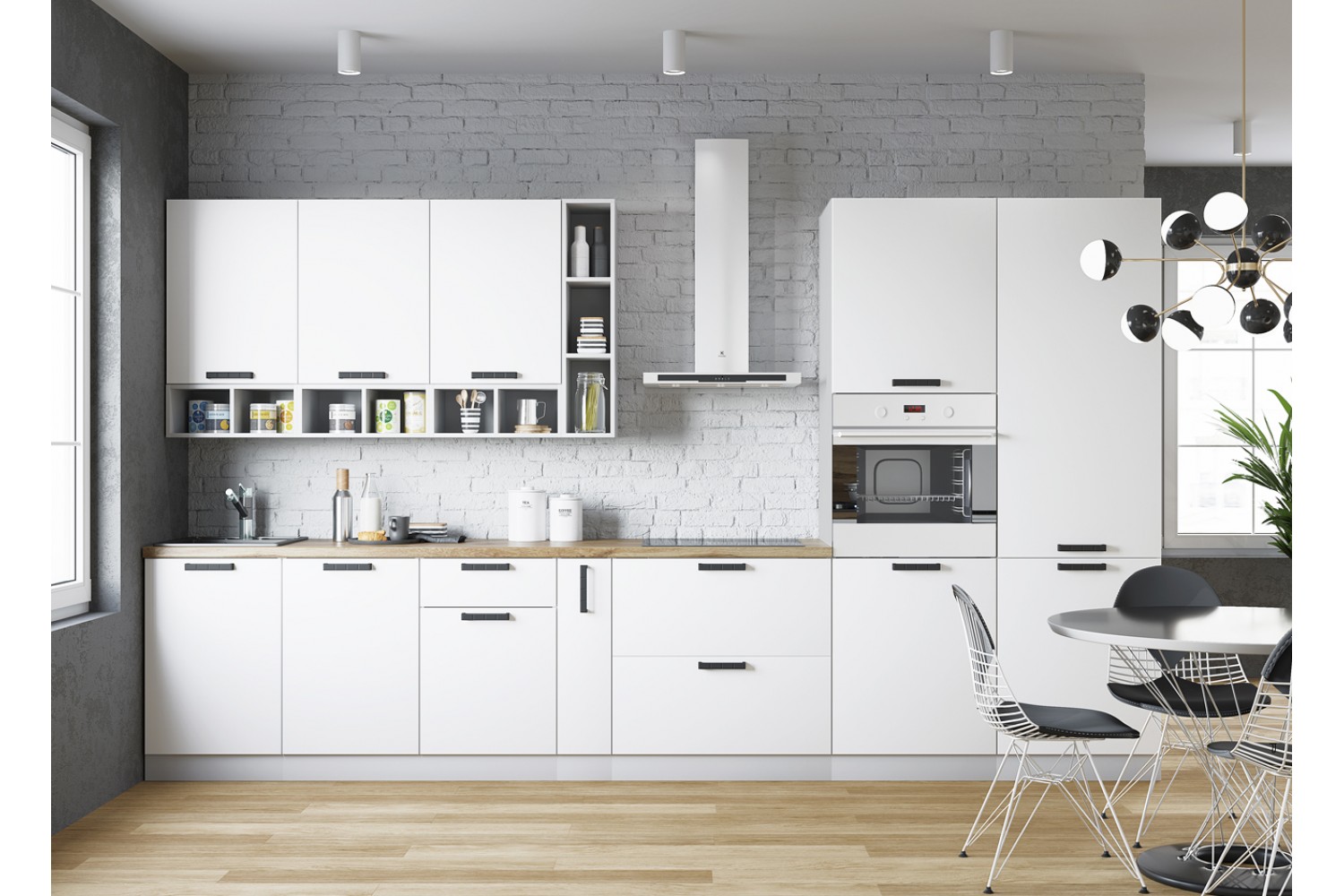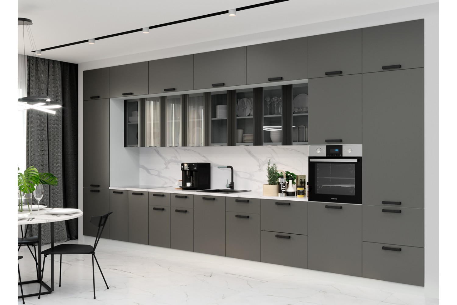 Модульная система выполнена в стиле «хай-тек», что представляет собой полностью разгруженную рабочую и обеденную секцию.