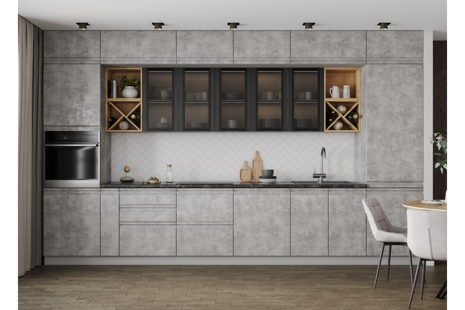 Здесь каждая деталь подобрана с филигранной точностью, а о практичности гарнитура говорят фасады с характерным, не марким орнаментом. Умеренное количество элементов доставит максимум пользы, а отсутствующие ручки придадут кухне брутальный, современный вид.