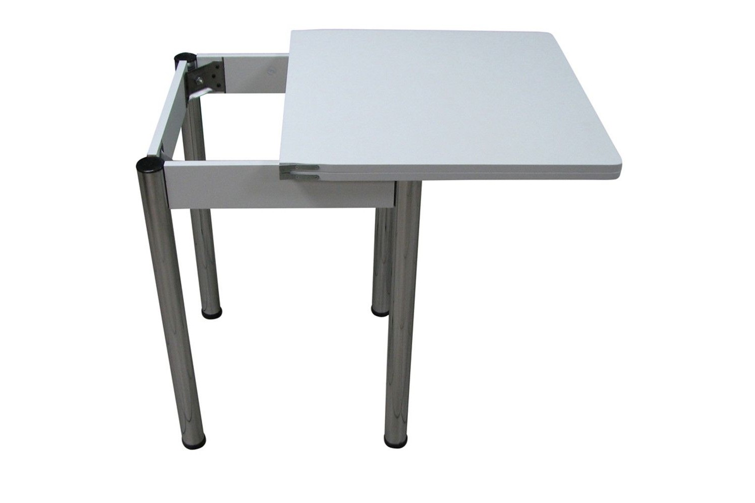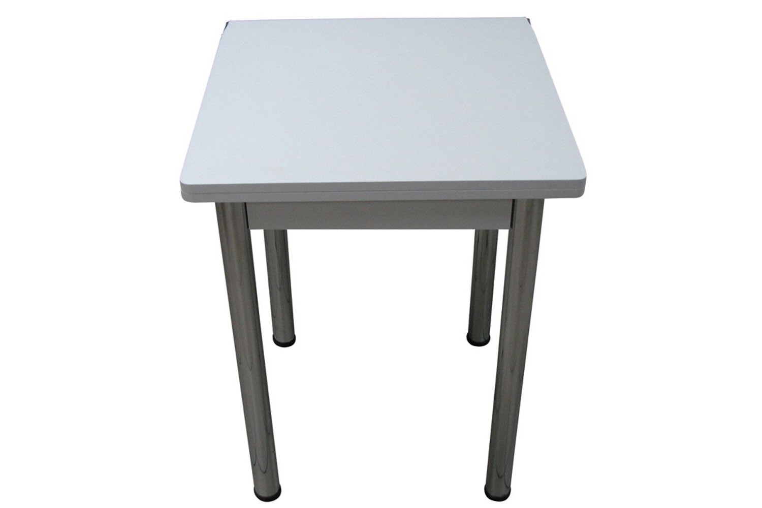 Описание Кухонный стол Ломберный поворотно-раскладной 600х600/1200 ЛДСП белый, ноги: металл (хром)