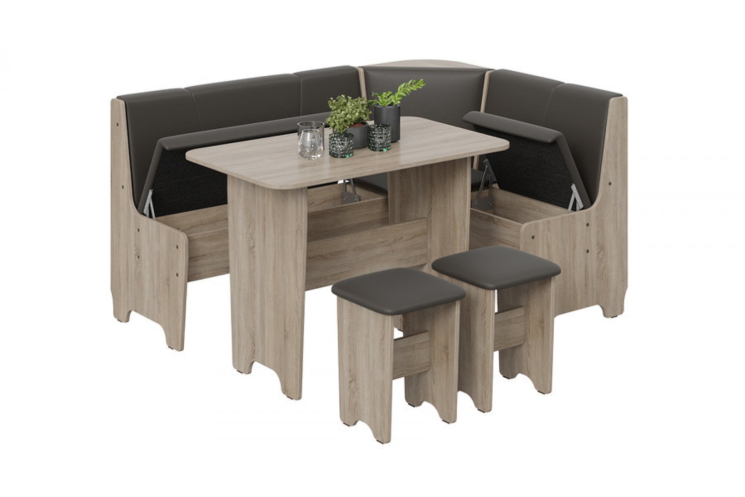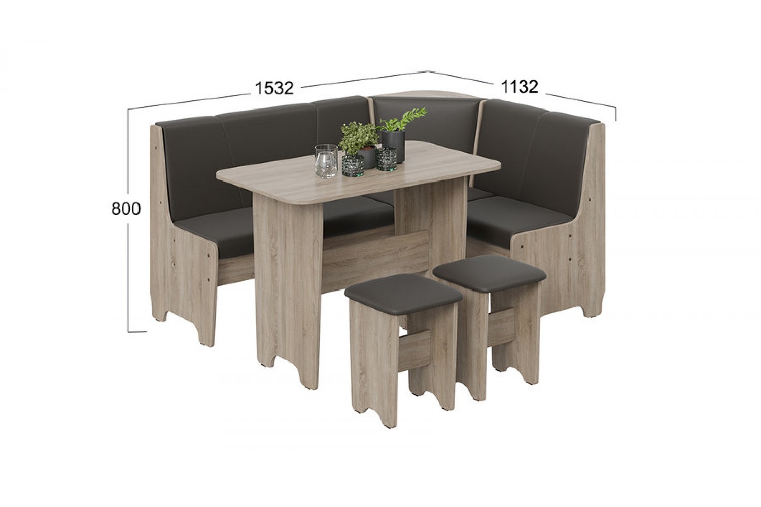 Размеры уголка: ширина — 1132 мм, высота — 800 мм, длина — 1532 мм. Просторная конструкция предоставляет достаточно места для всей семьи, а удобные сиденья обеспечивают комфорт во время приема пищи и общения.