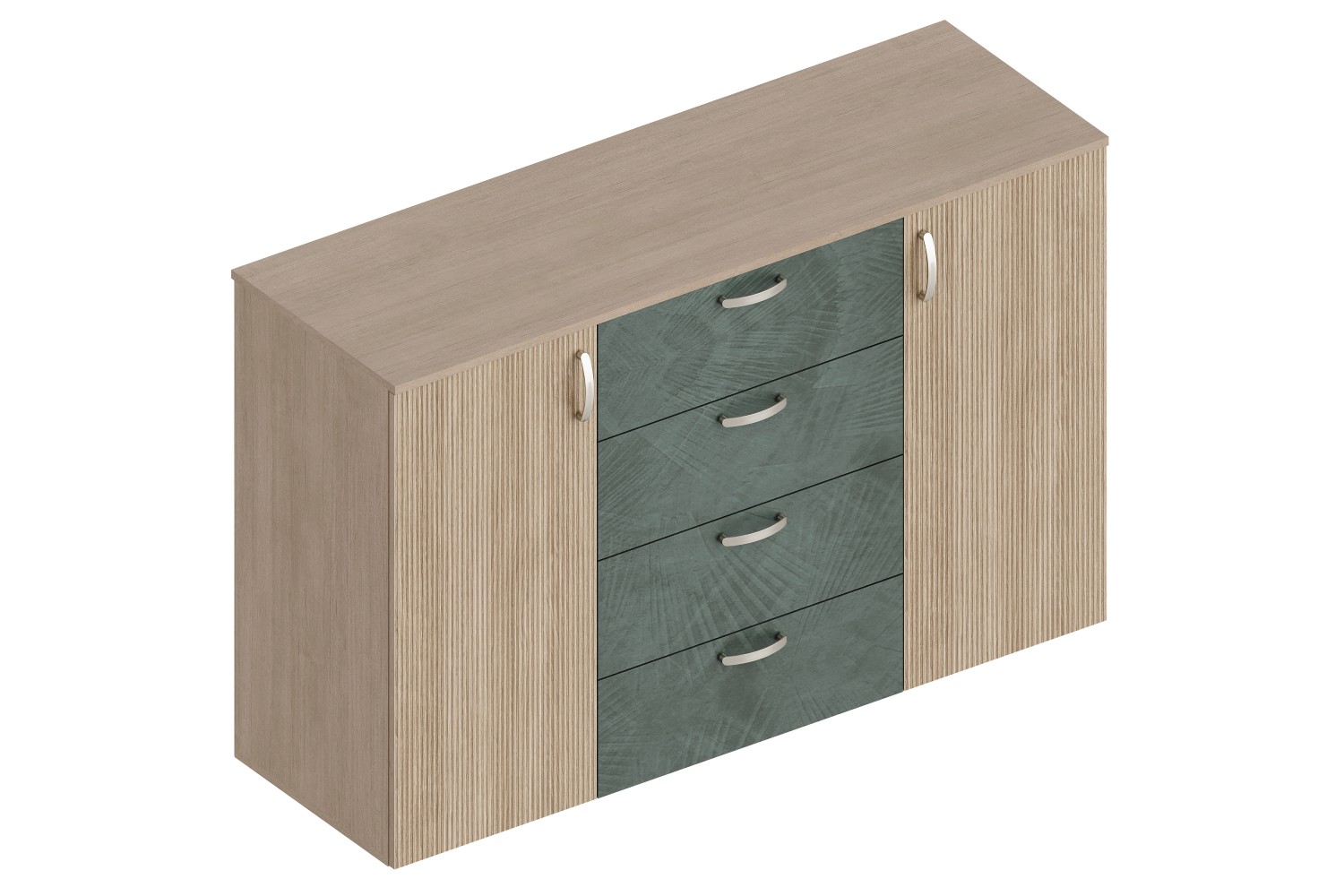 Конструкция комода включает торцы, облицованные кромкой ПП/ПВХ толщиной 1 мм, что обеспечивает долговечность и эстетичный вид. Удобные фурнитуры, включая полированную стальную ручку-скобу FS1038-128 и самоклеящийся белый отбойник на основе EVA, добавляют функциональности в его использование.