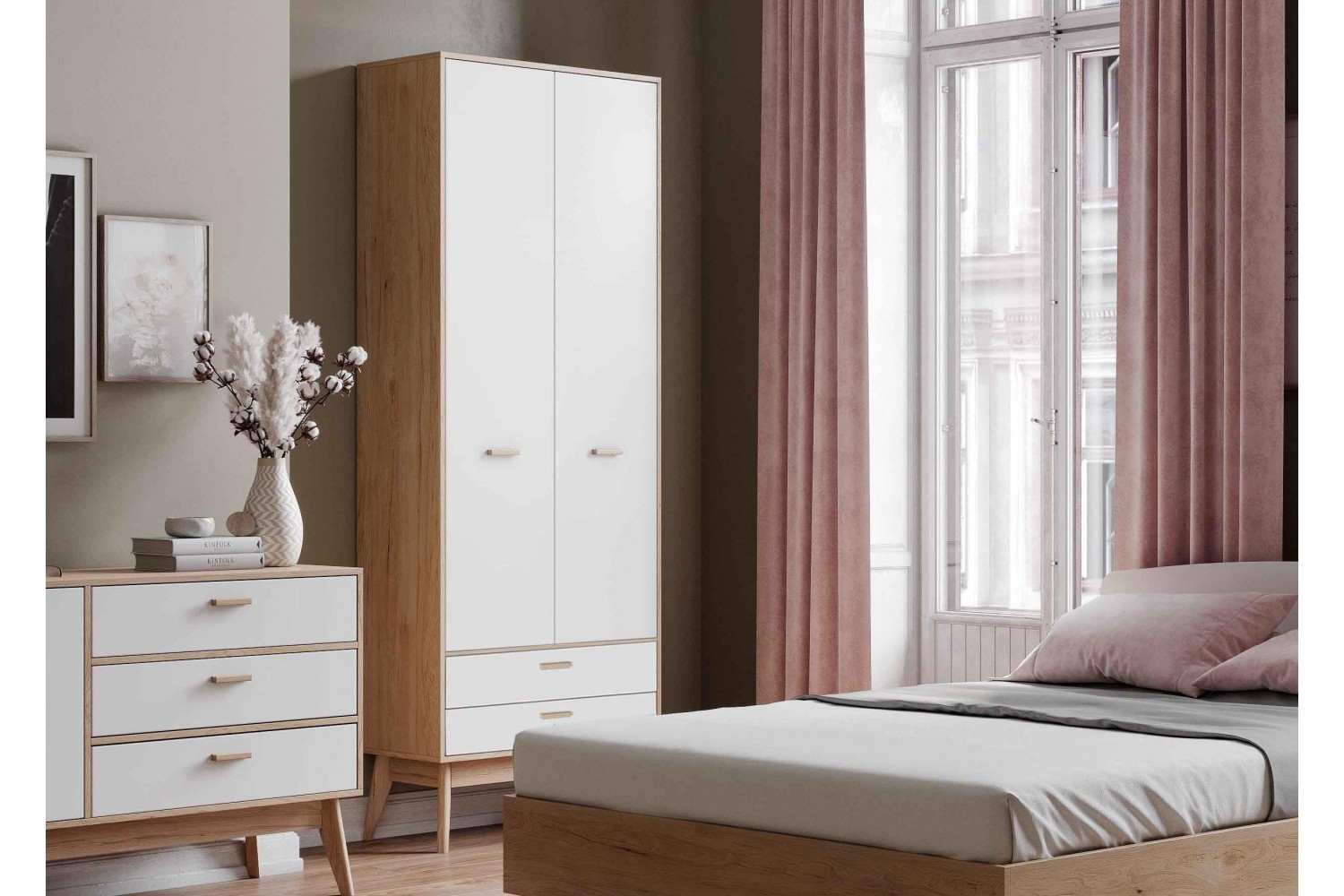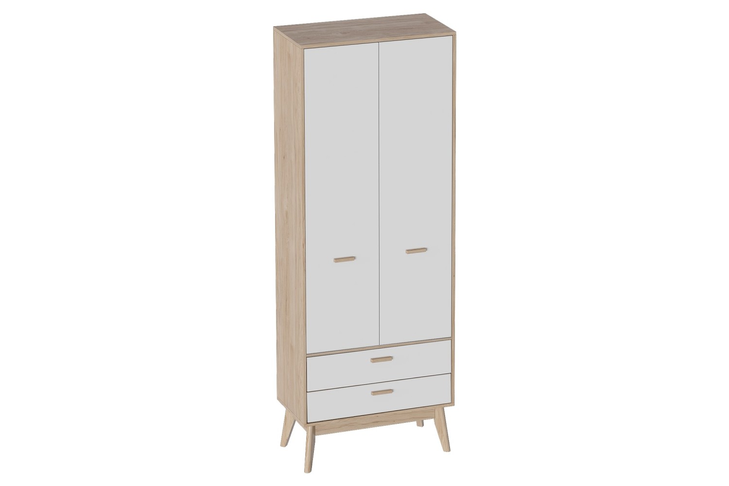 Элегантное цветовое исполнение в натуральном светлом дубе и белом матовом цвете придаст вашему интерьеру современный и стильный вид. Два вместительных ящика в нижней части шкафа позволят удобно хранить мелкие вещи, а два дверных отсека обеспечат легкий доступ к одежде и аксессуарам.