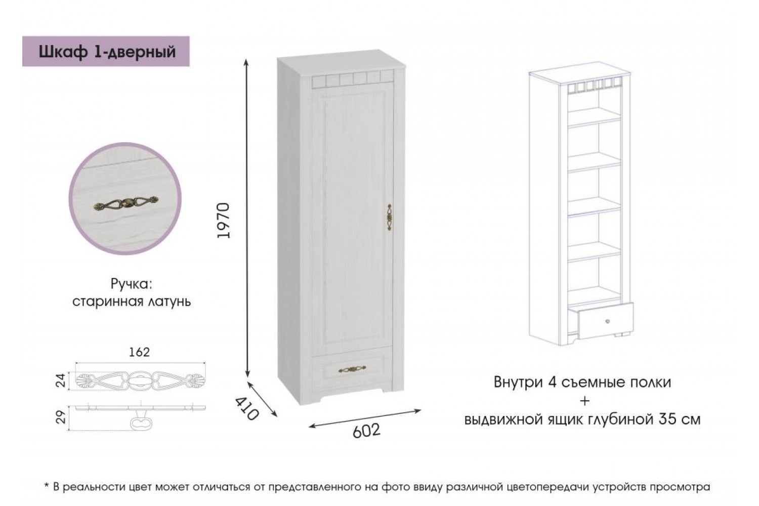 Изготовленный из высококачественного ЛДСП толщиной 16 мм и МДФ, он гарантирует долговечность и надежность. Однодверный дизайн обеспечивает легкий доступ к содержимому, а его классический стиль в духе Прованса добавляет шарм и уют в вашу комнату. Выберите шкаф "Прованс" 410 для функционального и стильного оформления вашего интерьера!
