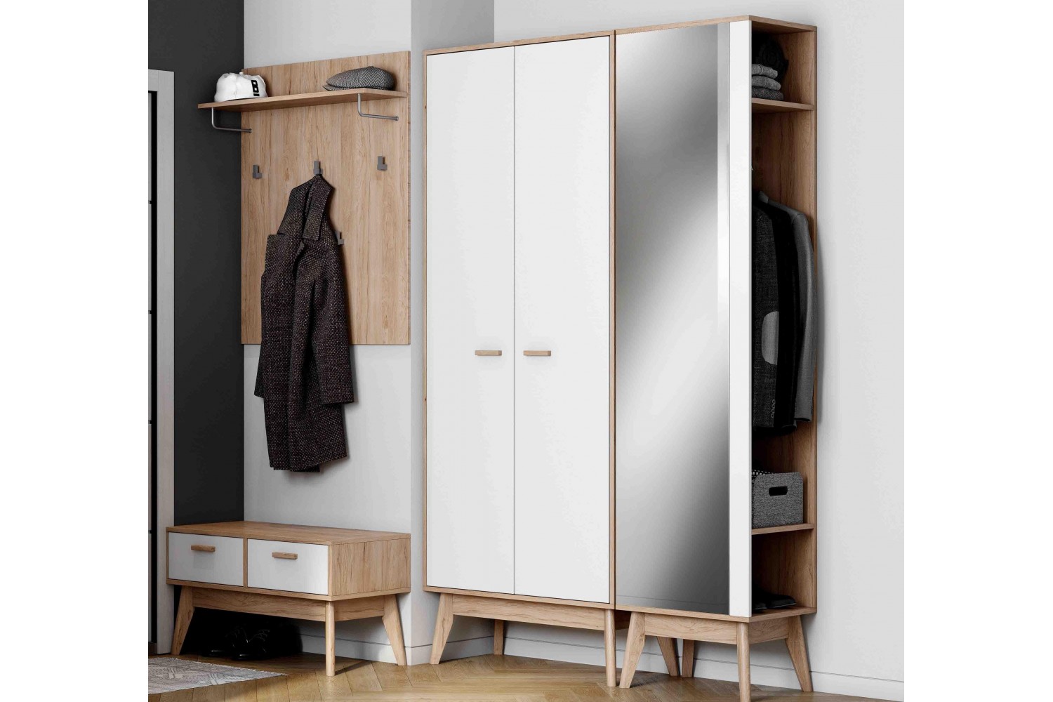 Изготовленный из высококачественных материалов, шкаф имеет опоры из массива берёзы, которые покрыты прозрачным лаком, что придаёт изделию не только прочность, но и изысканный вид. Элегантное исполнение в светлом натуральном дубе и белом матовом цвете создаёт атмосферу уюта и стиля в вашем интерьере.