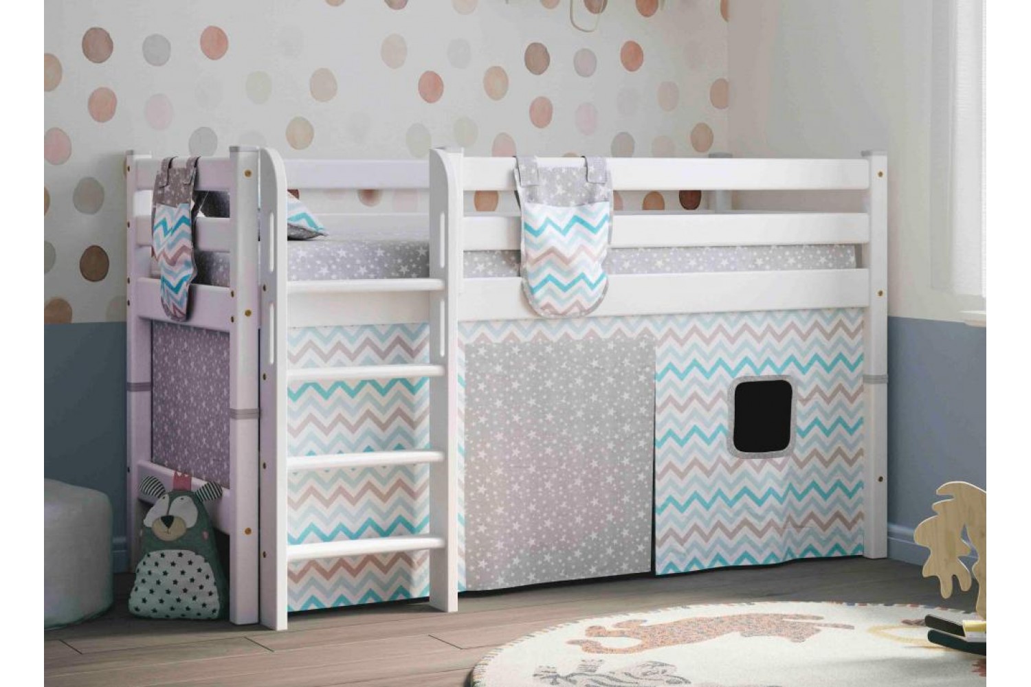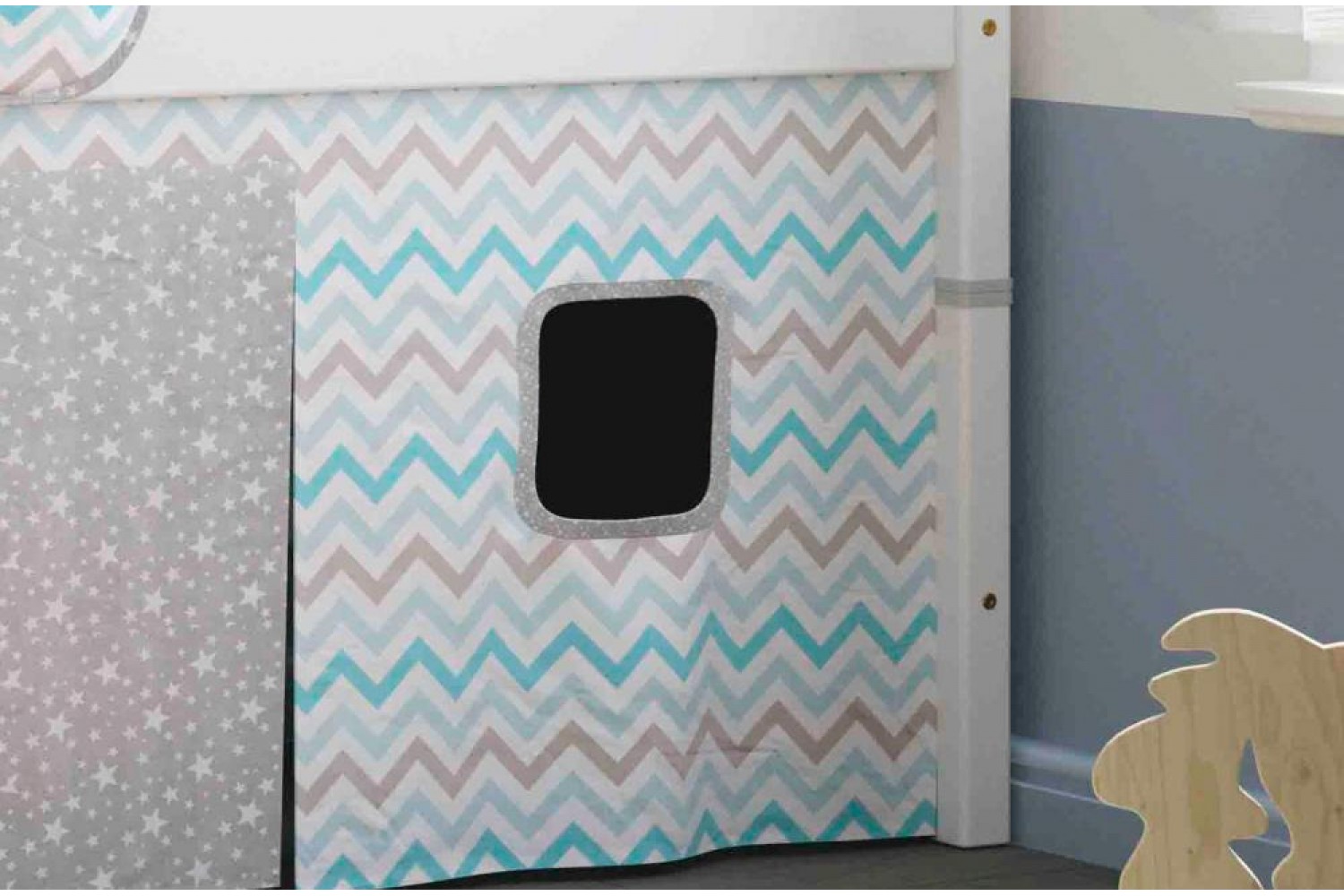 Описание Штора для низкой кровати Соня Зигзаг небесный/Звездопад на сером