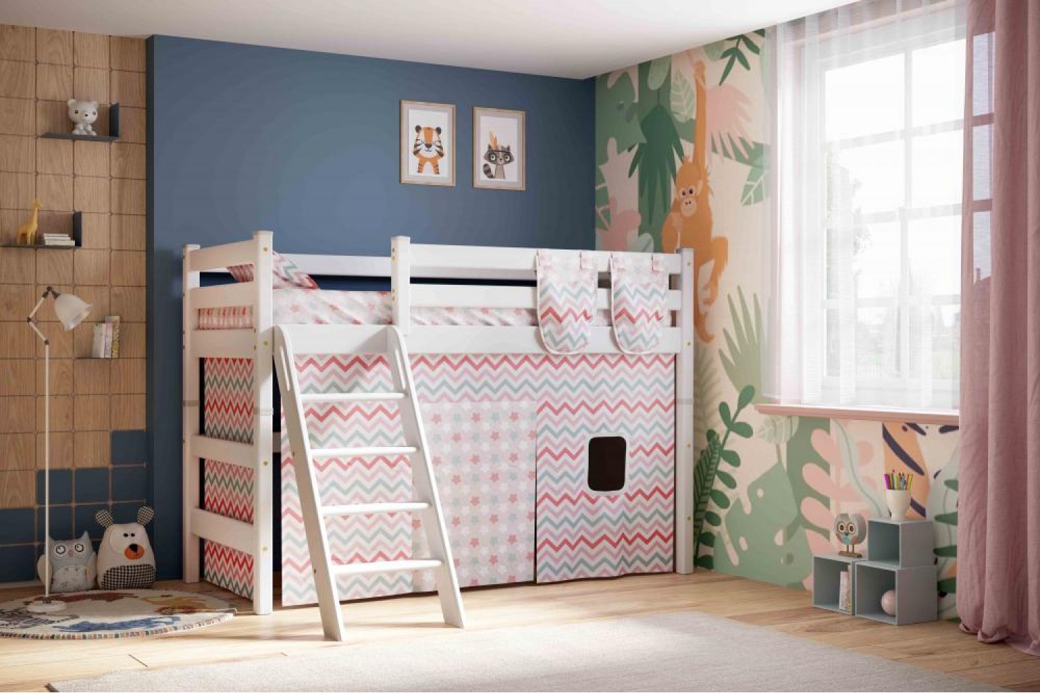 Штора для полувысокой кровати Соня в коралловом цвете с зигзагами и пряниками