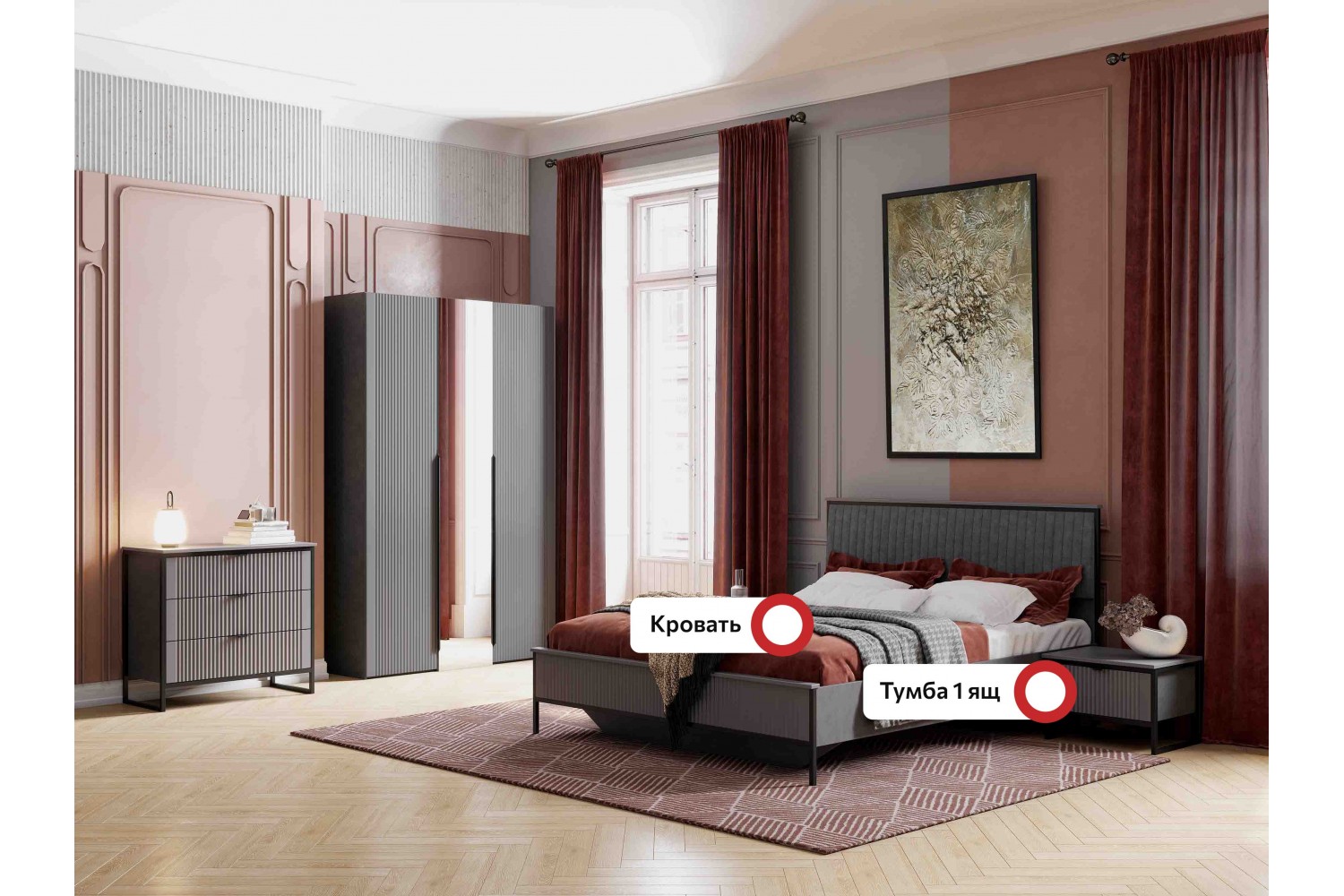 Спальный гарнитур "Нора" композиция #1 от фабрики МебельГрад – идеальное решение для создания уютной и стильной спальни. Этот гарнитур оснащен надежными шариковыми направляющими ящиков, что обеспечивает легкость и плавность их открывания. Спальное место размером 1600х2000 мм подходит для комфортного отдыха вдвоем. Элегантные черные матовые ручки добавляют современный акцент и гармонично вписываются в общий дизайн. Выберите спальный гарнитур "Нора" для создания атмосферы уюта и стиля в вашем доме.