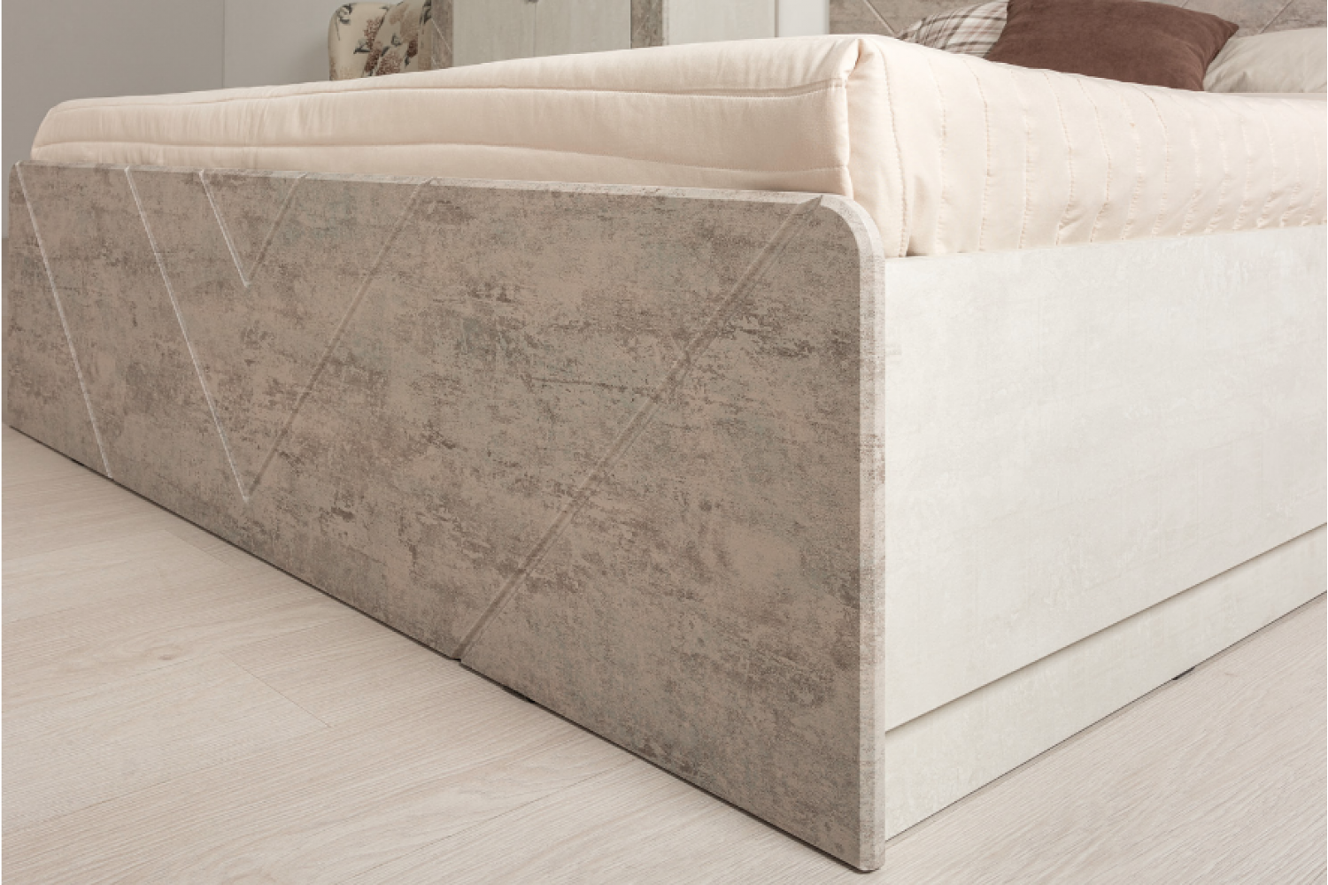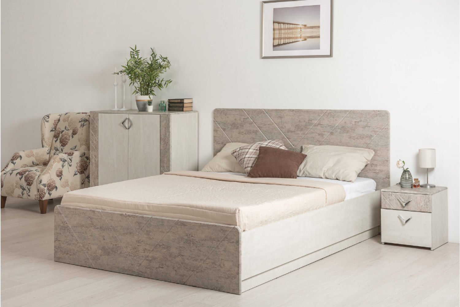 Кровать оснащена прочным каркасом и качественным ортопедическим основанием, что обеспечивает комфортный сон и поддержку для позвоночника. Прикроватные тумбы имеют удобные ящики для хранения мелочей, а комод предлагает дополнительное пространство для одежды и аксессуаров.