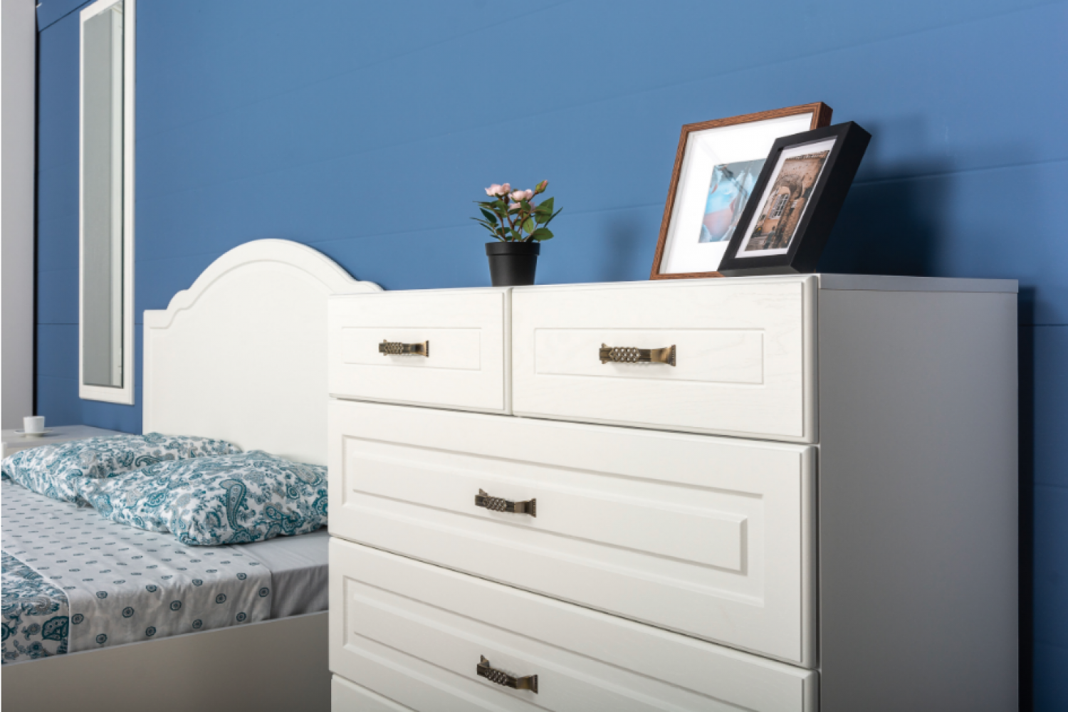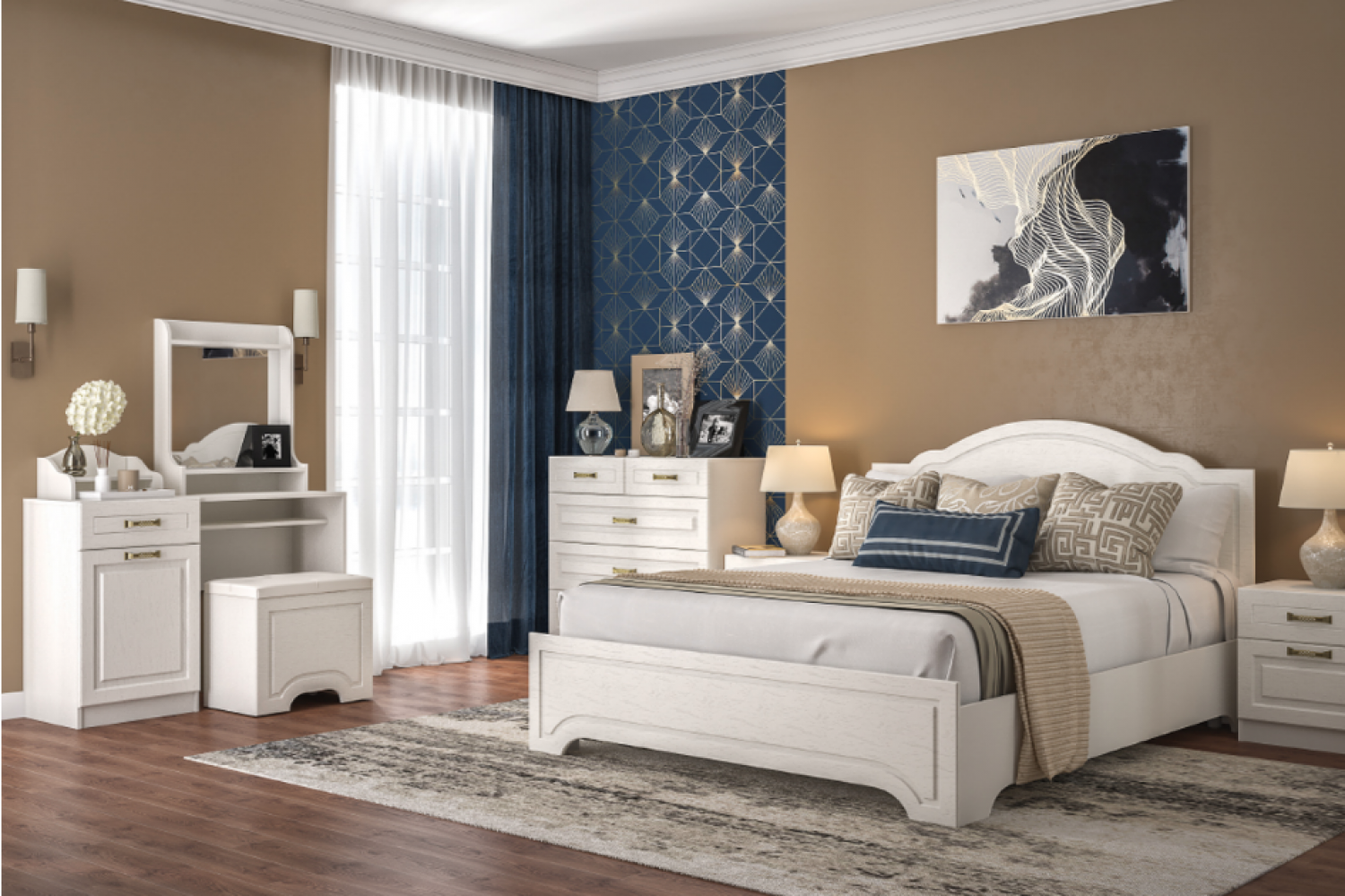 В комплект входят: двуспальная кровать с ортопедическим основанием, вместительный шкаф с зеркальными дверцами, комод с несколькими ящиками для хранения и прикроватные тумбочки. Элегантный дизайн с современными линиями и мягкими цветами легко впишется в любой интерьер.