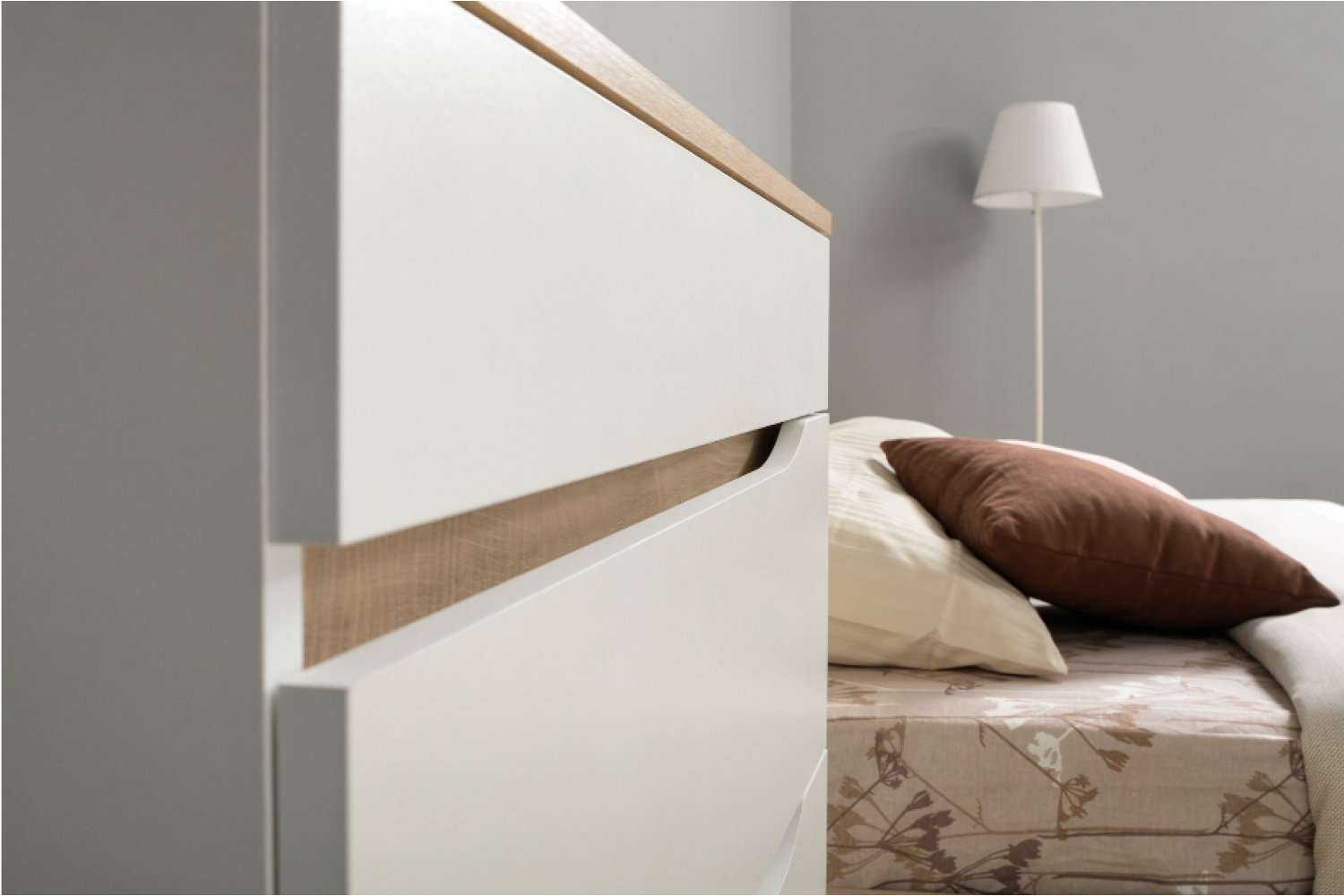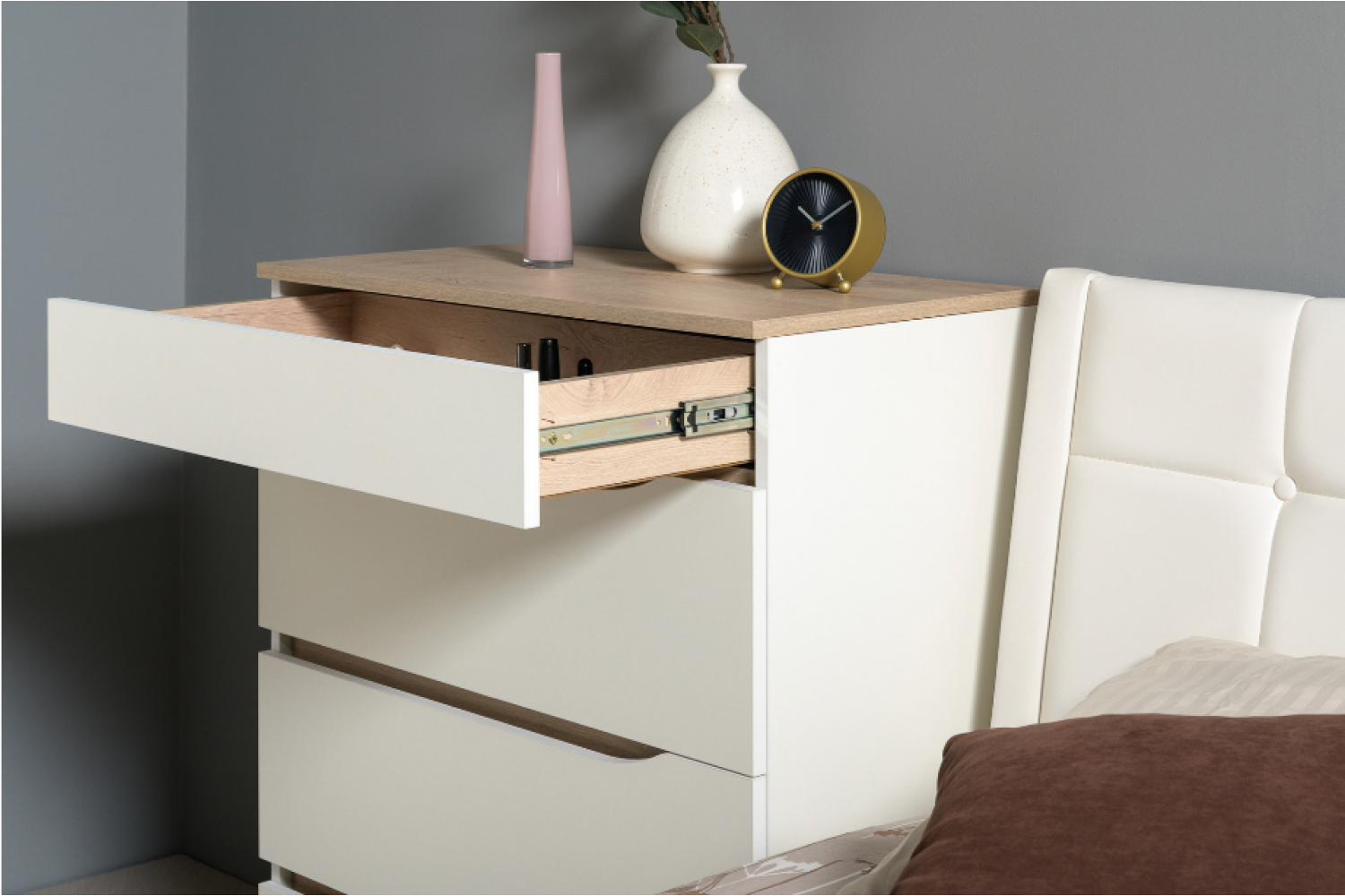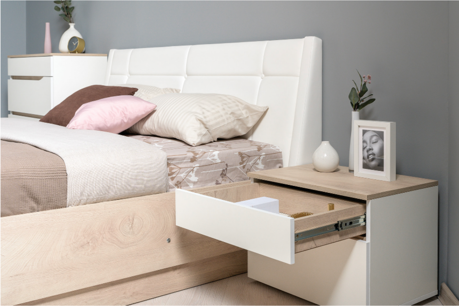 Размеры кровати: 160x200 см. Шкаф оснащен раздвижными дверями, что экономит пространство. Комод и тумбочки имеют удобные ящики для хранения.