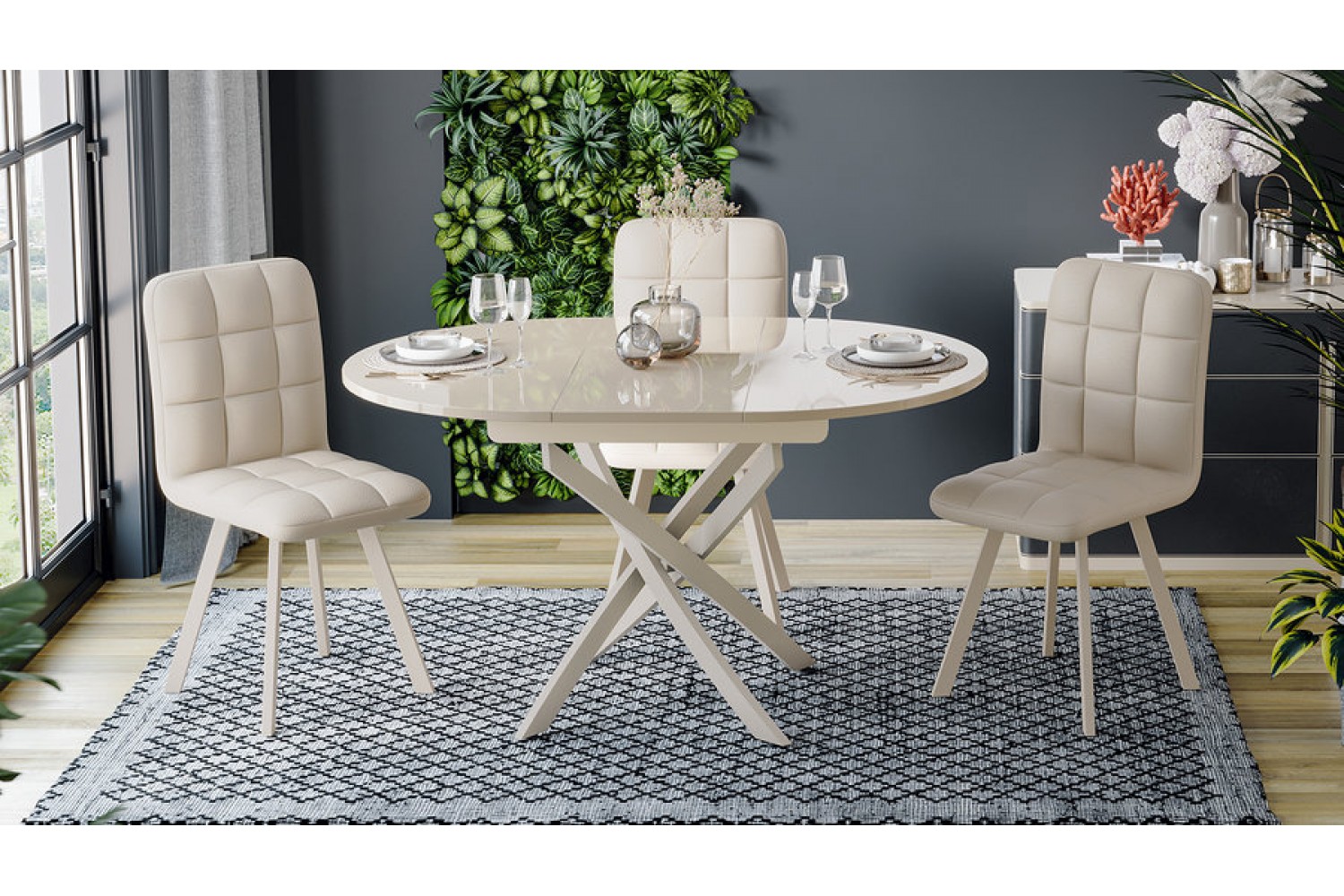 Стол оснащен металлическими ножками, обеспечивающими надежную поддержку и стабильность. Благодаря механизму раскладки, габаритная длина стола в разложенном виде достигает 1380 мм, что позволяет удобно разместить за ним большую компанию. С четырьмя опорами и стильным дизайном, стол «Diamond» станет центром притяжения в вашем доме, сочетая функциональность и элегантность.