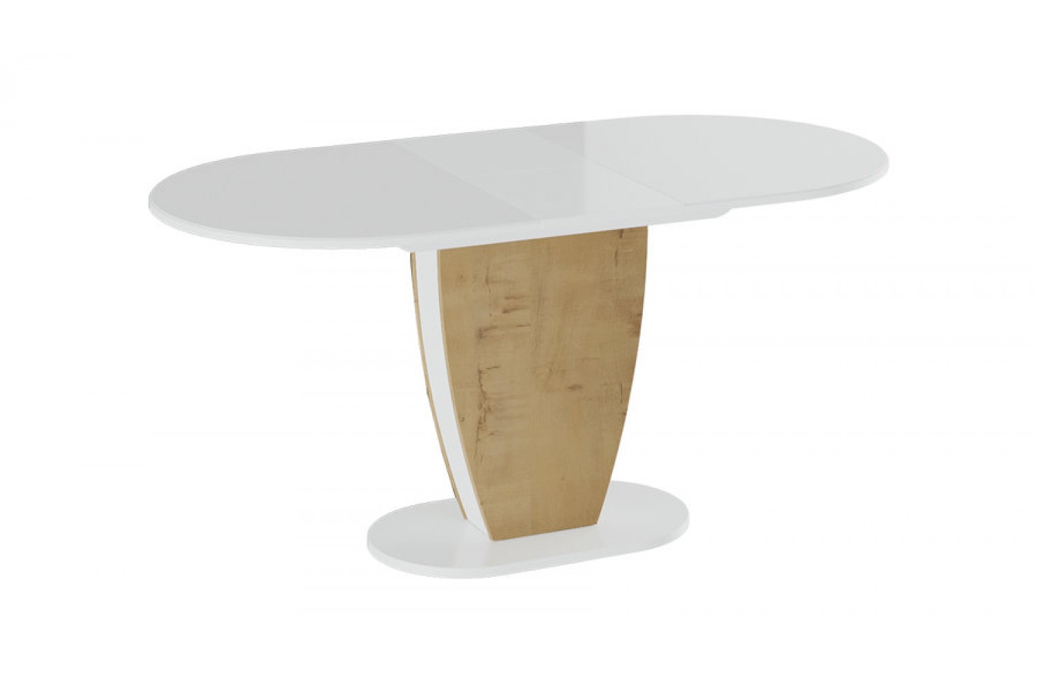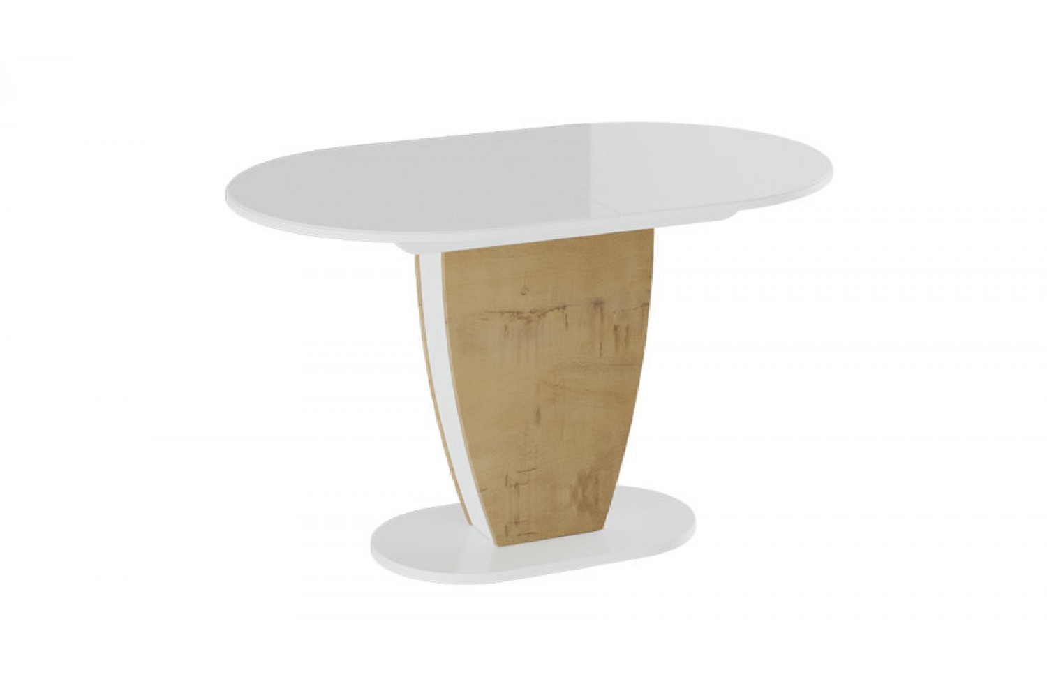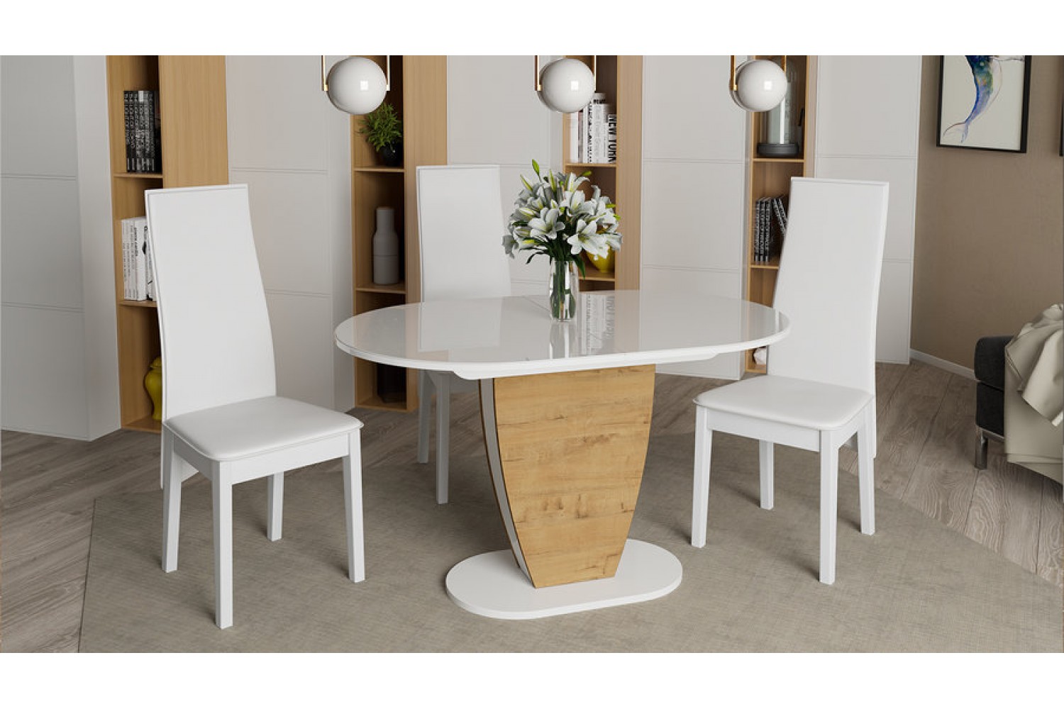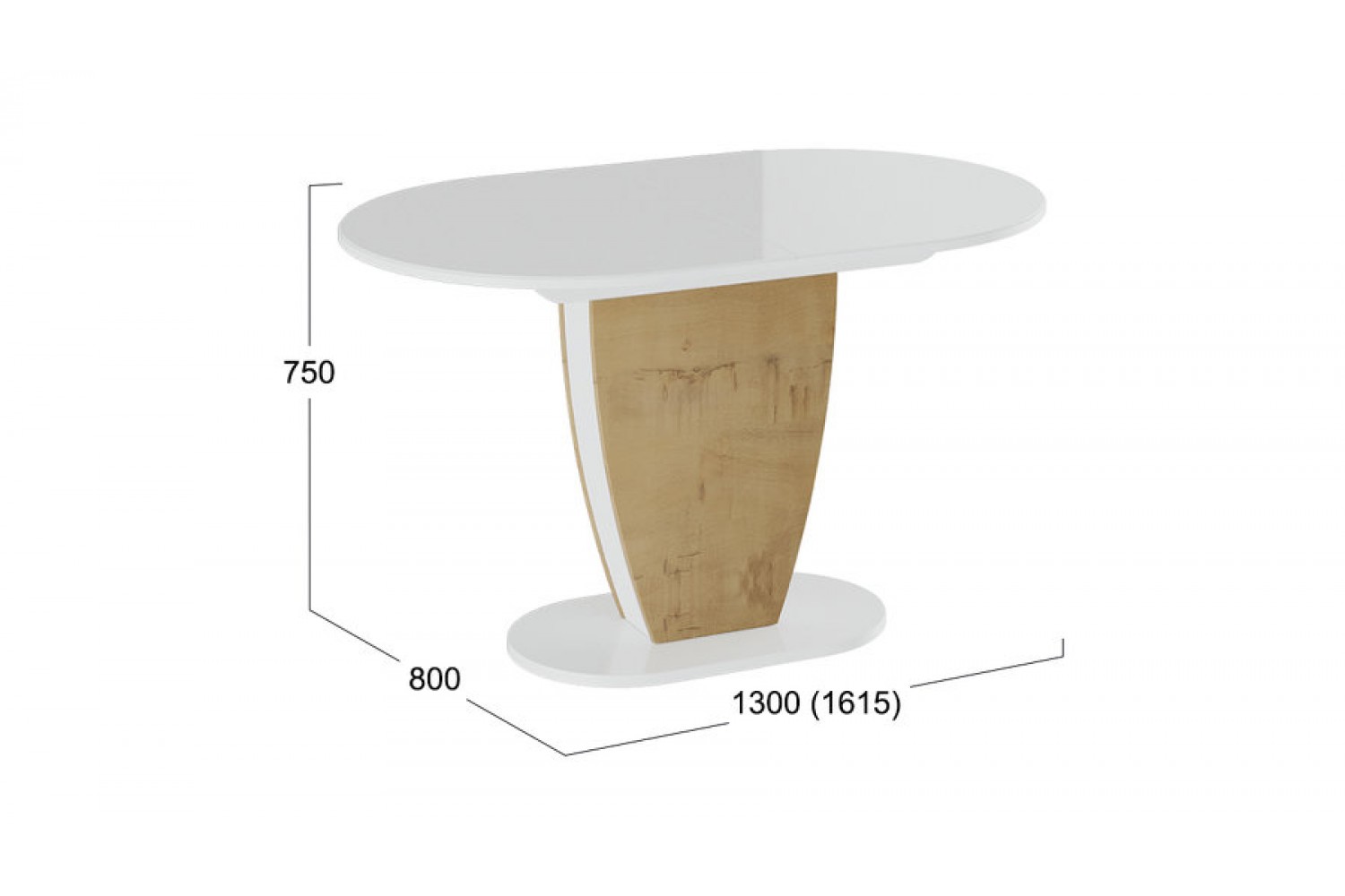 Ножки и опора изготовлены из ЛДСП и МДФ, а кромка столешницы и ножек защищена ПВХ, что гарантирует долговечность и устойчивость к повреждениям. В разложенном виде габаритная длина стола достигает 1615 мм, что позволяет комфортно разместить за ним семью или друзей.