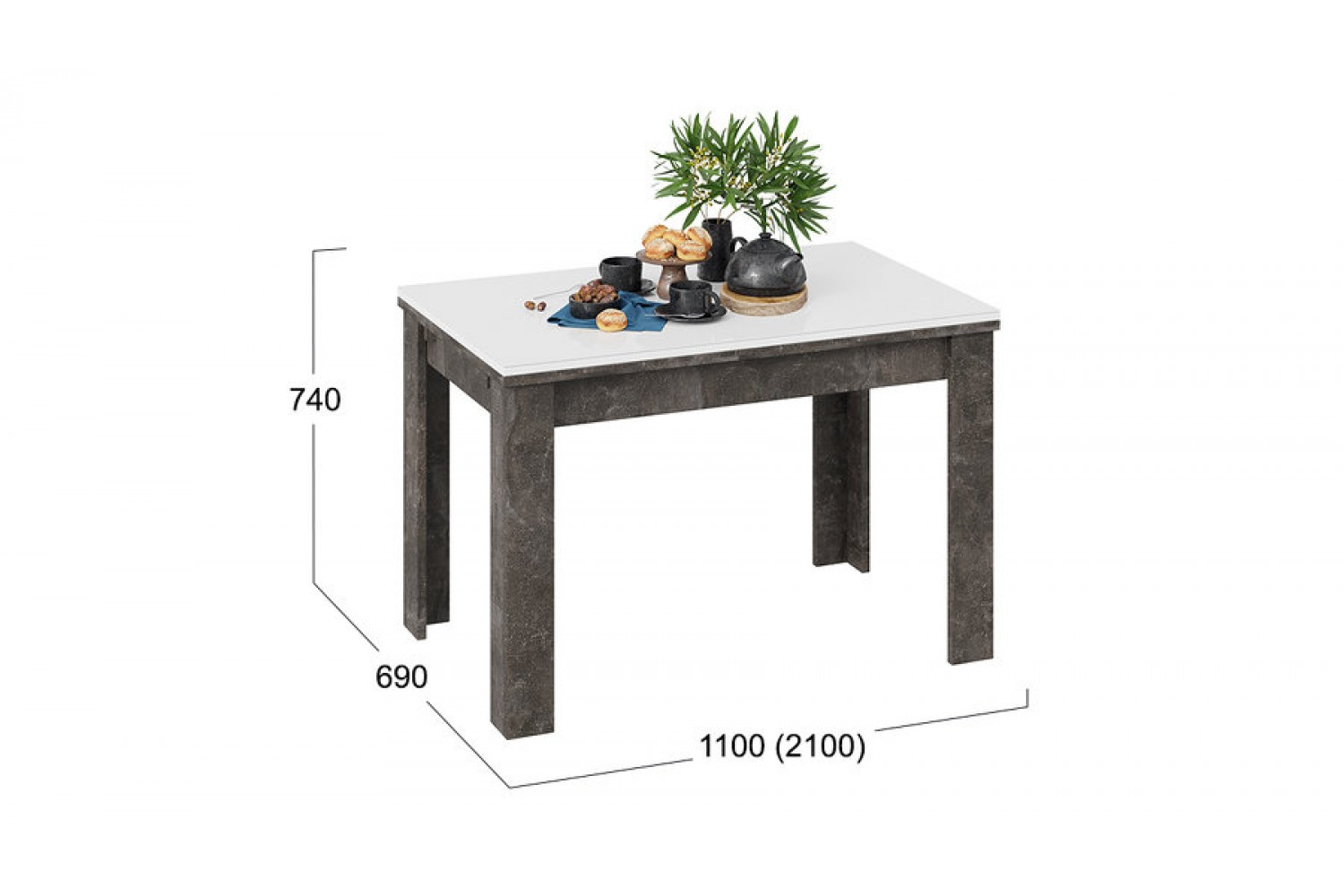 Удобный механизм раскладки позволяет увеличить габаритную длину до 2100 мм, что делает стол универсальным для больших компаний. Четыре надежные опоры обеспечивают стабильность и надежность.