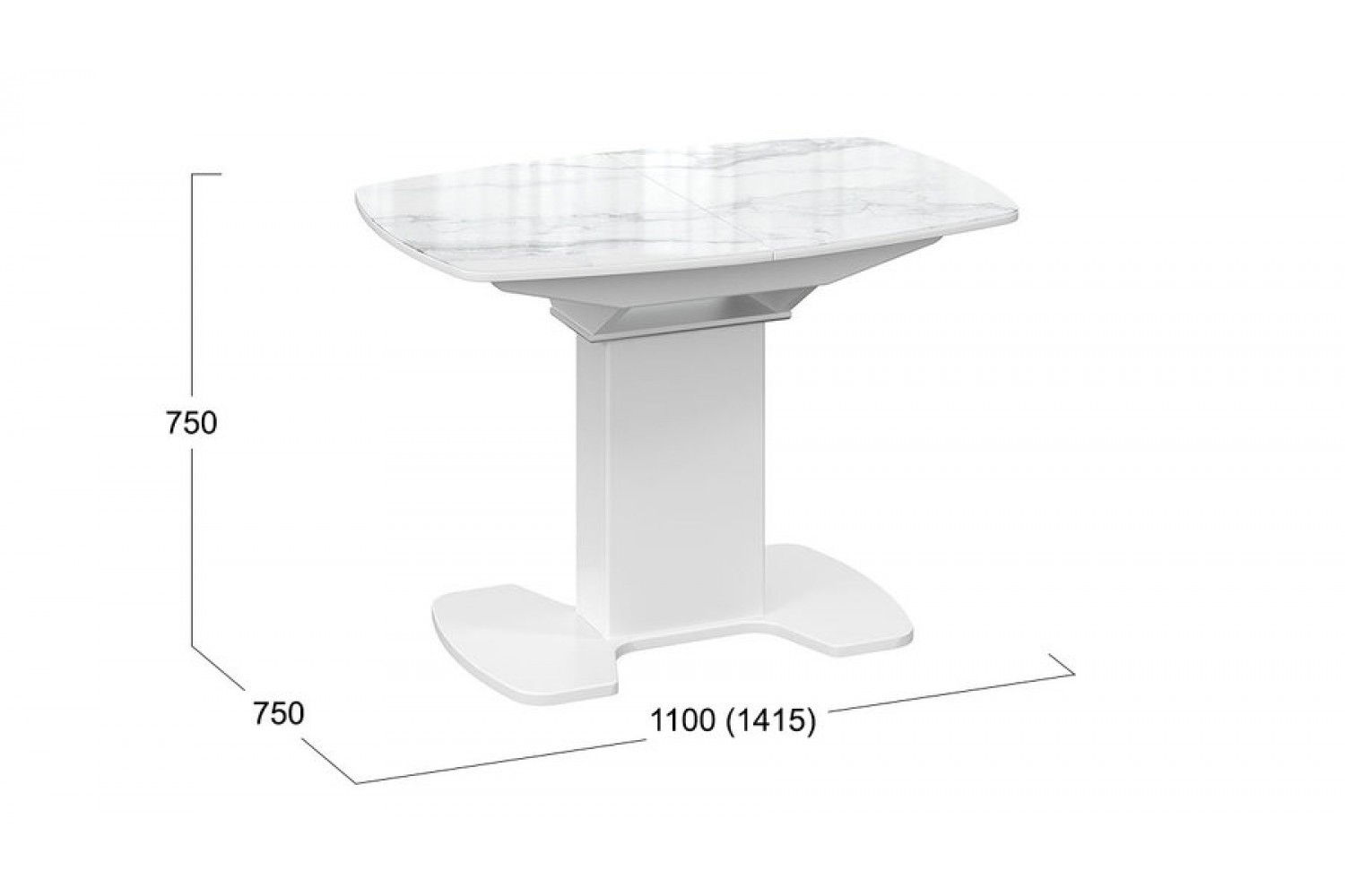 Габариты стола составляют 1100 мм в длину, 750 мм в ширину и 750 мм в высоту, что делает его подходящим для небольших и средних помещений. При необходимости, стол может быть разложен до 1415 мм благодаря встроенному механизму раскладки, что обеспечивает дополнительное пространство для гостей.