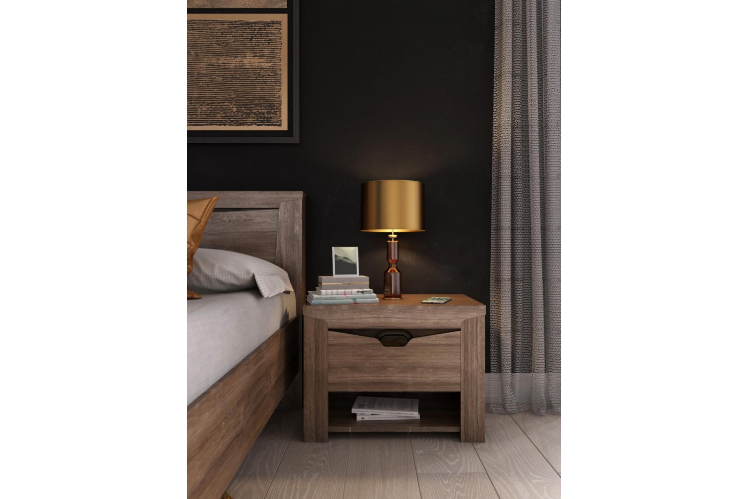 Декоративный вырез на фасаде ящика не только придает тумбе стильный вид, но и выполняет функцию ручки, что делает открытие ящика простым и удобным. Цвет дуба стирлинг добавляет тепла и уюта в интерьер вашей спальни.