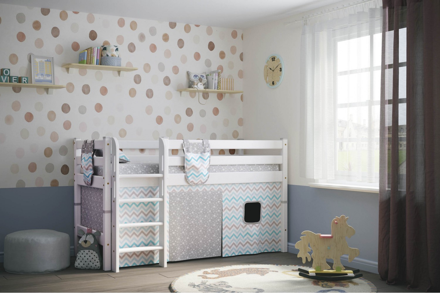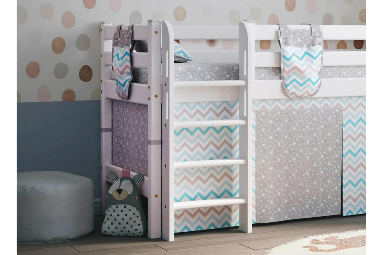 Кровать оснащена прямой лестницей, что делает её удобной для детей и взрослых. Особенностью модели является возможность сборки на обе стороны, что позволяет адаптировать её под любые интерьерные решения. Выбор белого цвета придаёт кровати легкость и свежесть, а также позволяет легко сочетать её с другими элементами мебели.