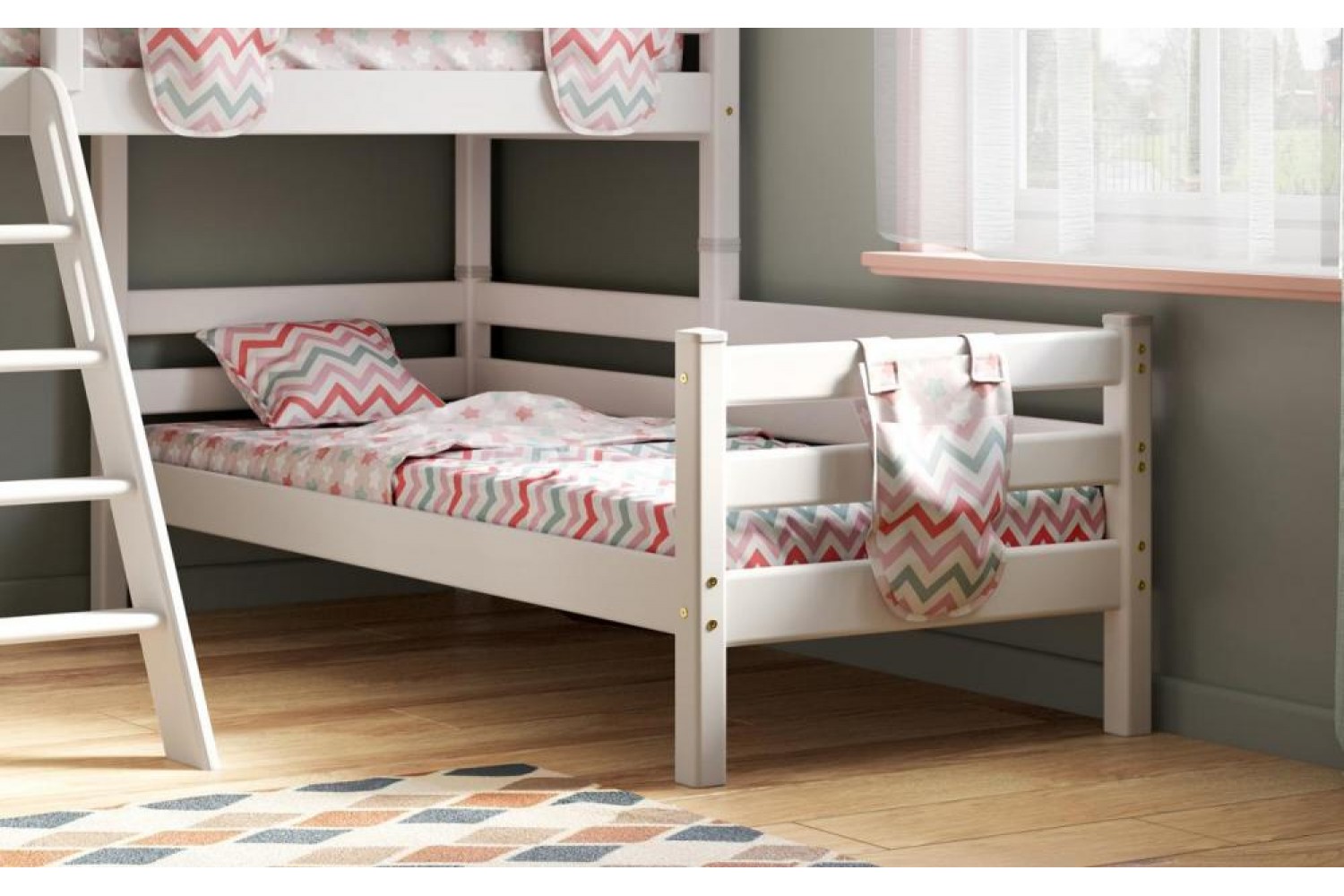 Высота кровати составляет 1440 мм, что позволяет легко вставать и ложиться, а спальное место размером 800х1900 мм гарантирует комфортный отдых. Уникальная наклонная лестница добавляет удобства при использовании, а возможность сборки на обе стороны делает "Соню" универсальным вариантом для любых планировок.